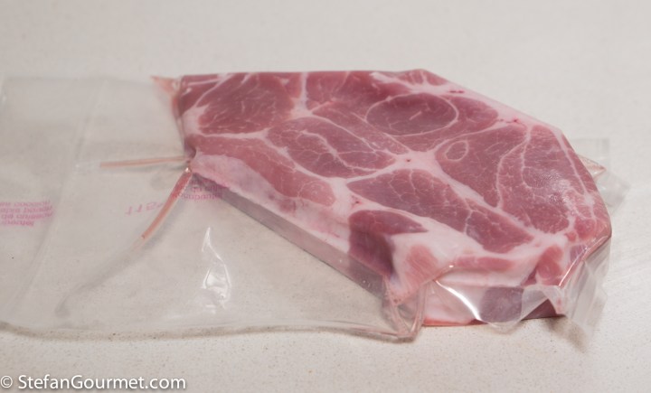 Season the pork shoulder with salt and vacuum seal.