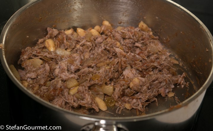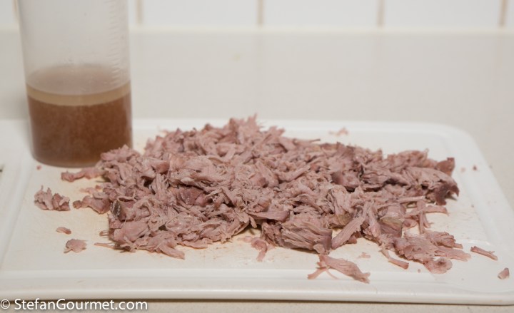 Pull the pork apart with two forks. If you allow the container with juices to cool, the fat that floats on top will solidify and you can use it for the filling.