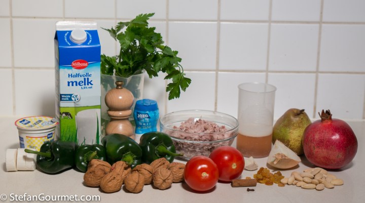 The most time-consuming part of this dish is in removing the skin and seeds from the poblano peppers. Or actually, it is skinning the walnuts. But I gave that up after 1 walnut as it is just too much fuss. I am sure the walnut sauce will be much nicer without the skins (which make the sauce a bit astringent), but it is still very tasty.