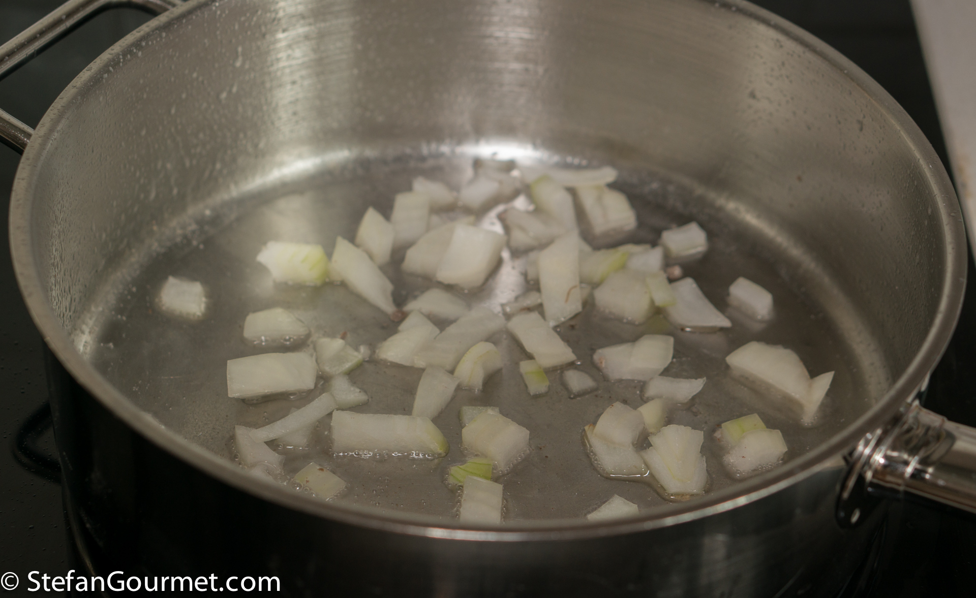 When the fat has melted, add the onion.