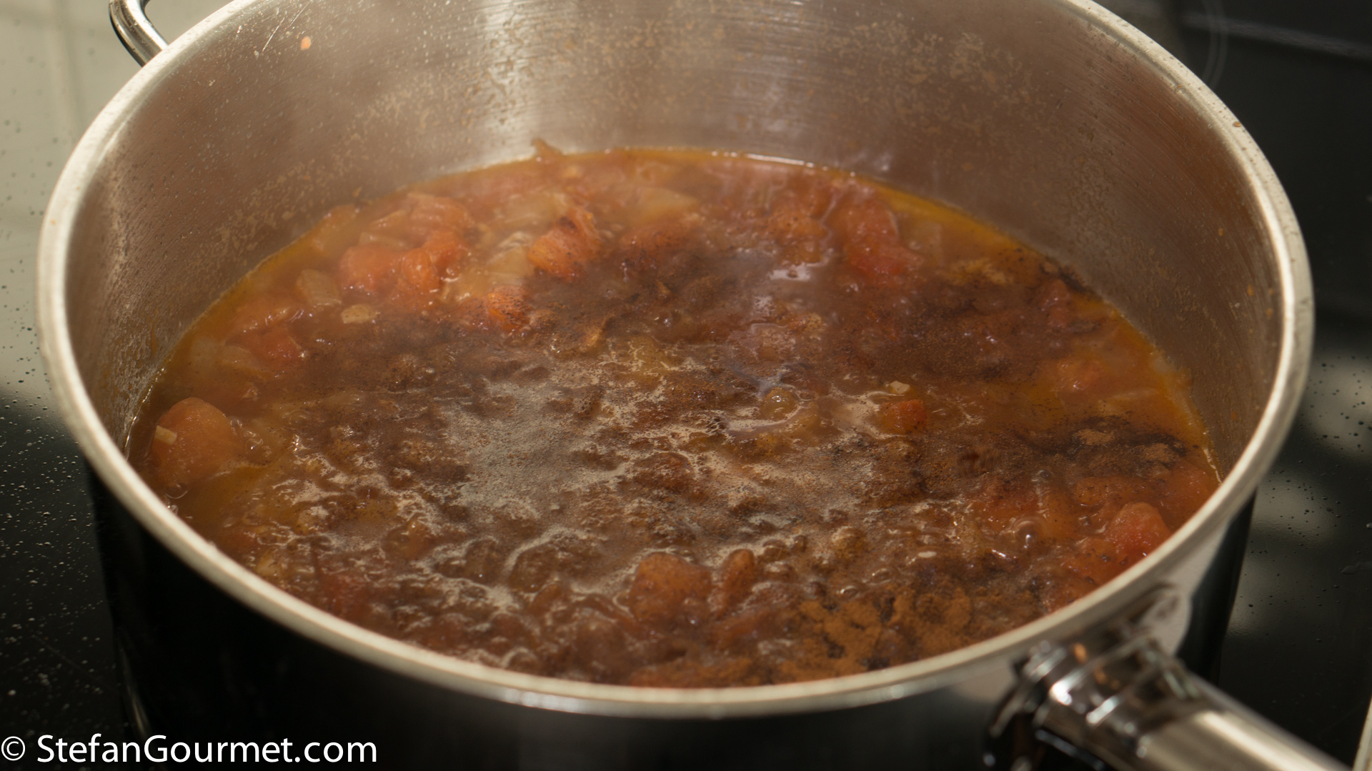 Cook over medium heat, stirring regularly, until the tomatoes have fallen apart and the sauce has thickened. Then turn off the heat.