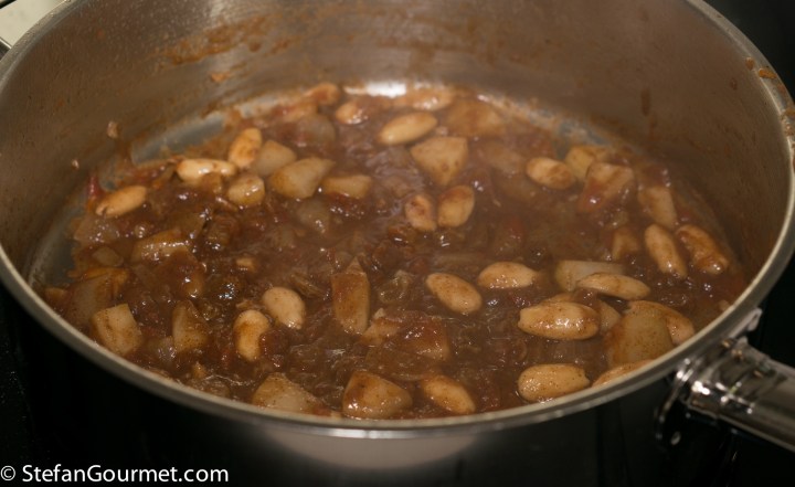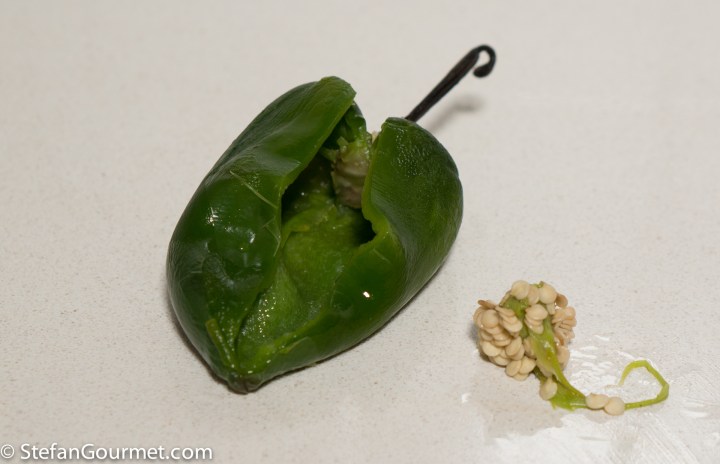 Chile en Nogada was created in 1821 by the Pueblan Nuns as a festive food to honor a visit from revolutionary general Don Augustín de Iturbide. Mexico had just won its independence from Spain. The colors of the dish are the same as in the Mexican flag: green poblano pepper and parsley, white walnut sauce, and red pomegranate seeds. It is a roasted poblano pepper filled with a picadillo of pork with fruits and nuts. I already wanted to make it when I saw it on Richard’s blog more than six years ago, but back then I could not get fresh poblano peppers. Now that I can get them I jumped at Elia’s suggestion to include this in the Mexican dinner. It is an unusual but delicious dish. There are many variations, but I stayed very close to Richard’s version. Poblano peppers can be almost as mild as green bell peppers, but they can also be quite spicy. If you can’t get poblano peppers and/or don’t like spicy food, you could substitute with green bell peppers. I cooked the pork sous-vide; for the traditional approach check out Richard’s recipe.