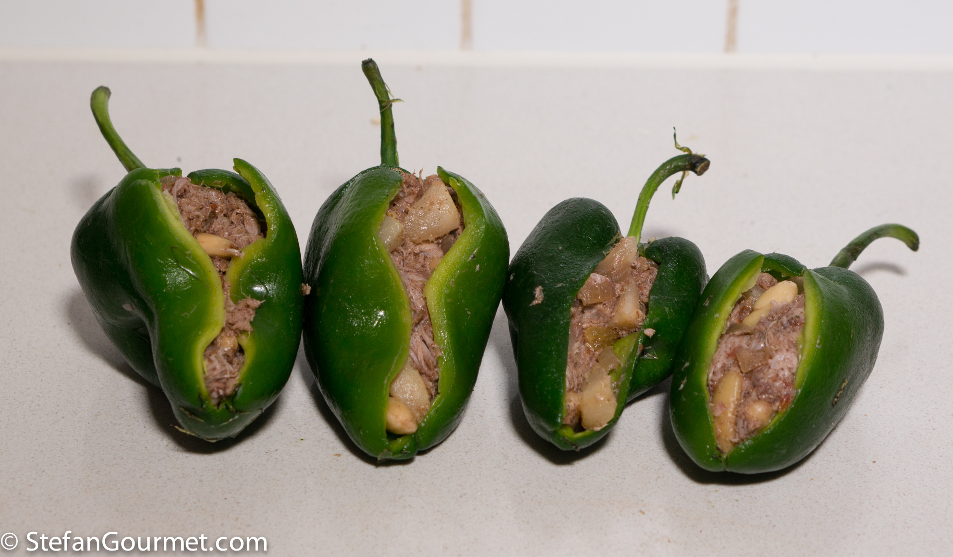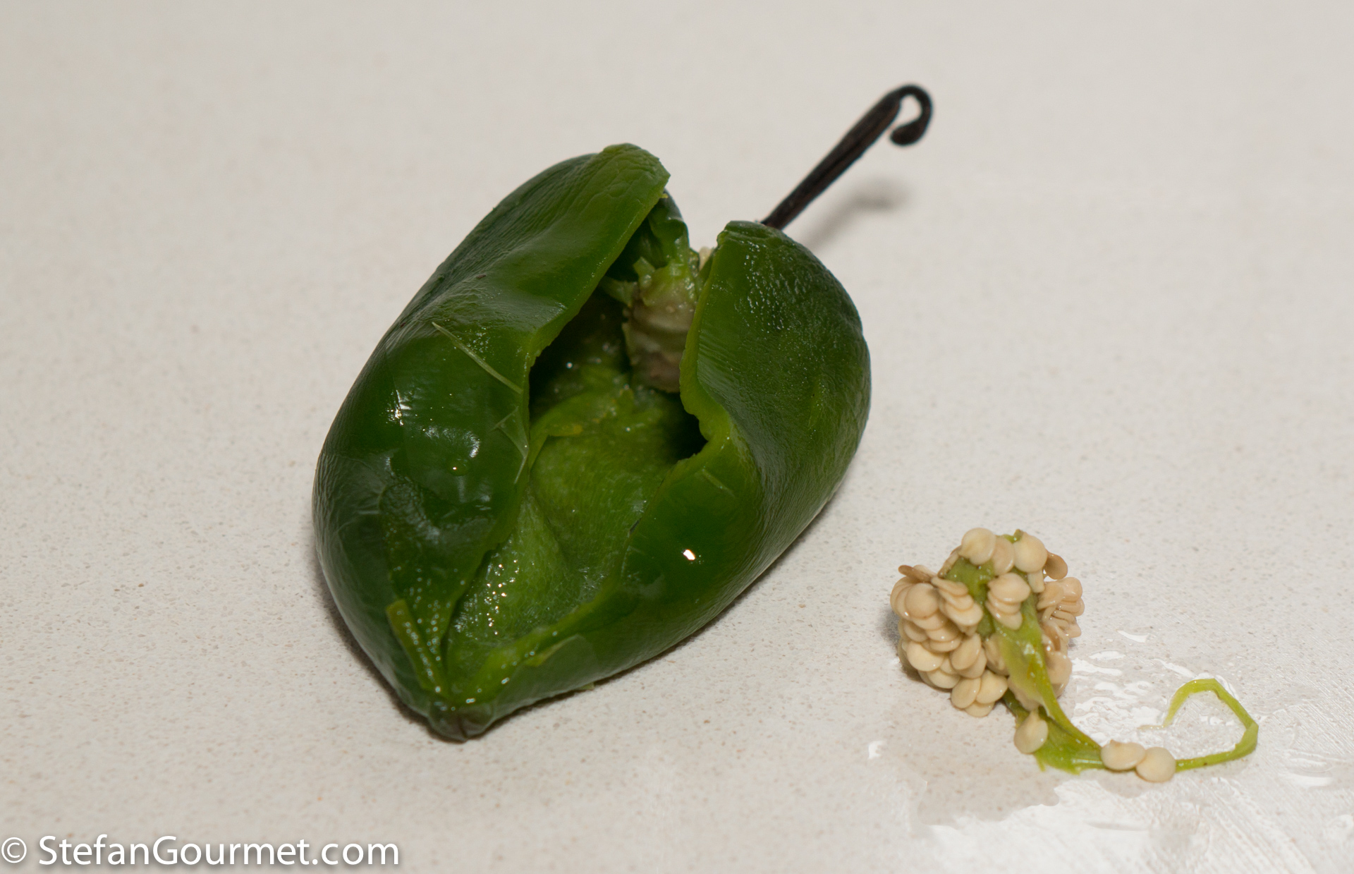 Carefully make a vertical slit in each pepper and remove the seeds.