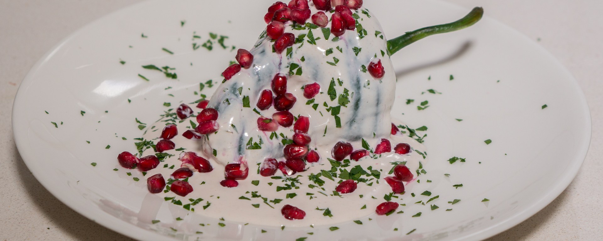 Serve the chiles with the open side down. Cover with the walnut sauce, and sprinkle with pomegranate seeds and parsley.