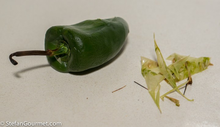 Peel the poblanos. It is okay if some pieces of skin are still there.