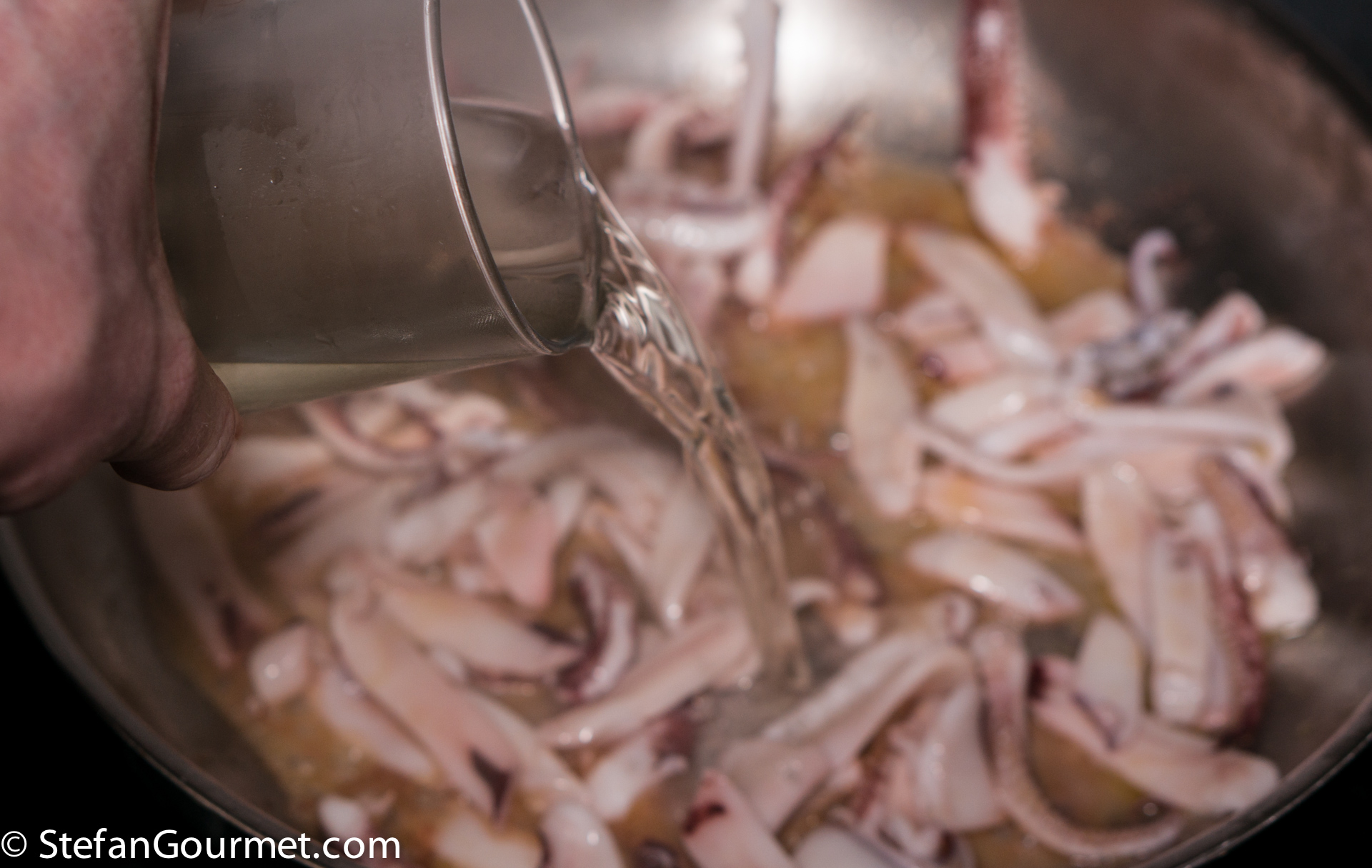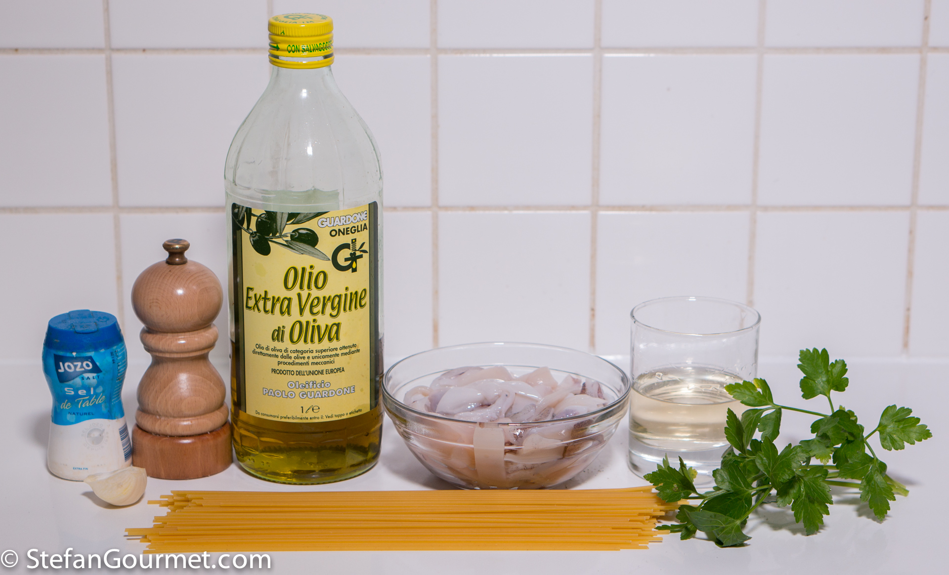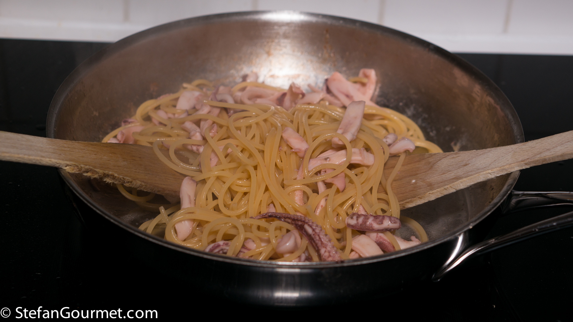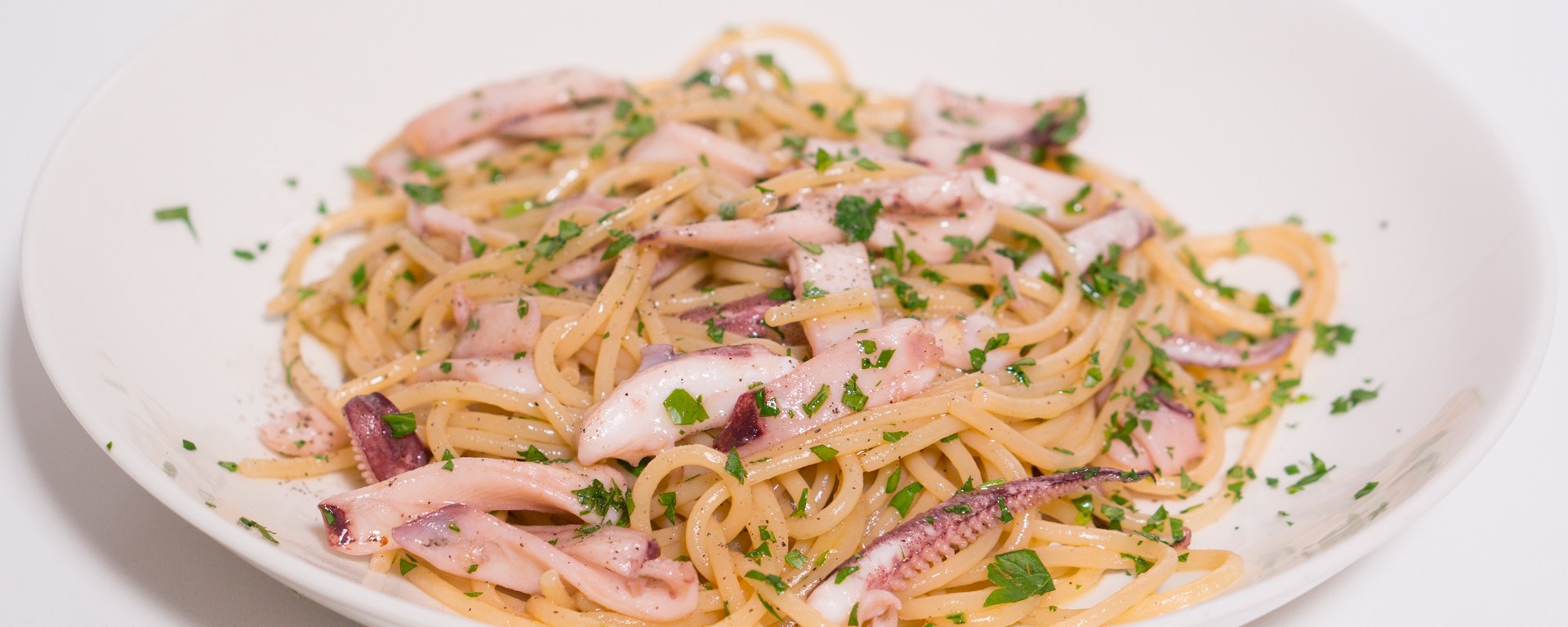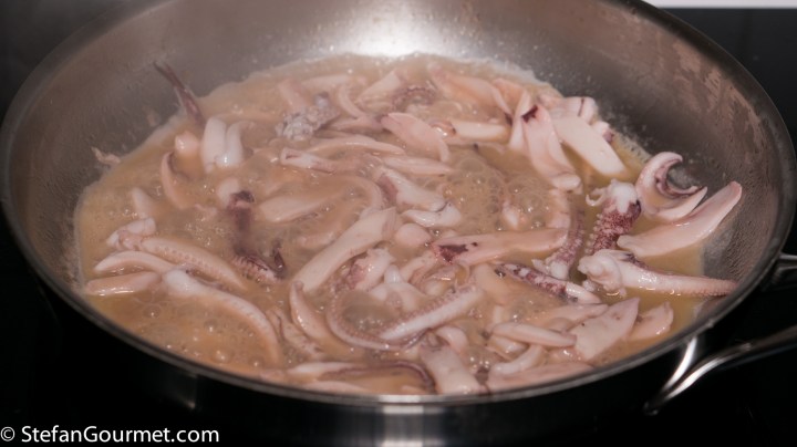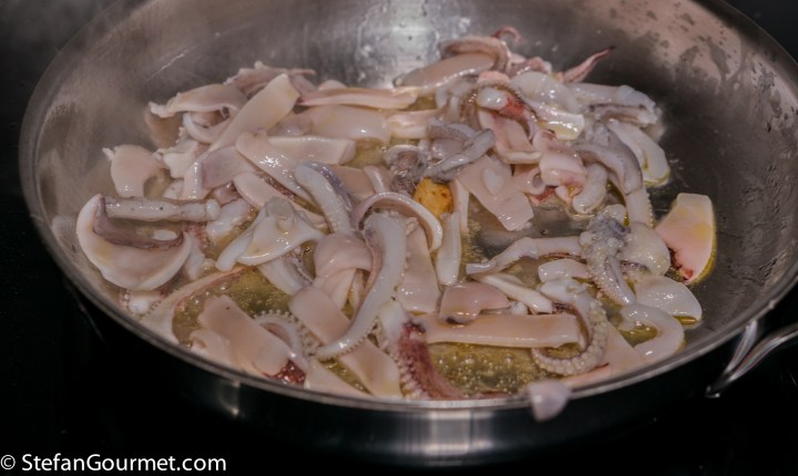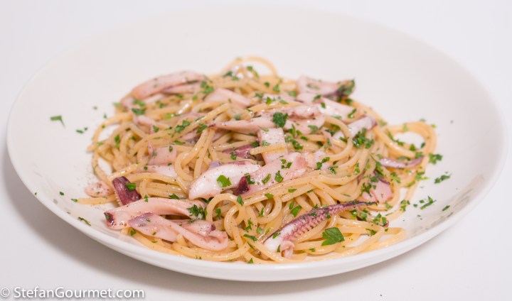 As long as the squid has already been cleaned, this recipe definitely won’t take longer than is needed to cook the spaghetti. If dishes that are often made with tomatoes are made without them, in Italy that is called in bianco, the white version of the dish. The opposite can be called in rosso, but that is usually omitted.