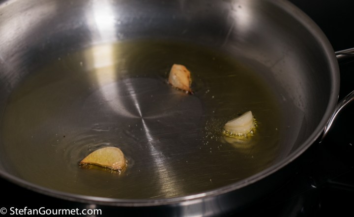 When the timer indicates there is 5 minutes left before you have to drain the spaghetti, heat the olive oil in a frying pan. Add the garlic, and cook until golden.