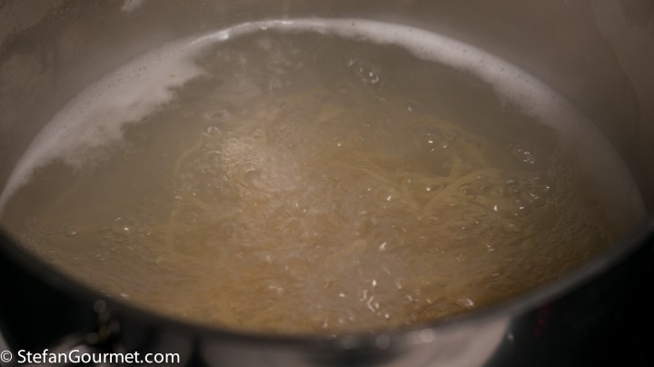 Bring a large pot of water to a boil. When the water boils, add salt and the spaghetti. Set the timer for 1 minute less than the time indicated for al dente on the package.
