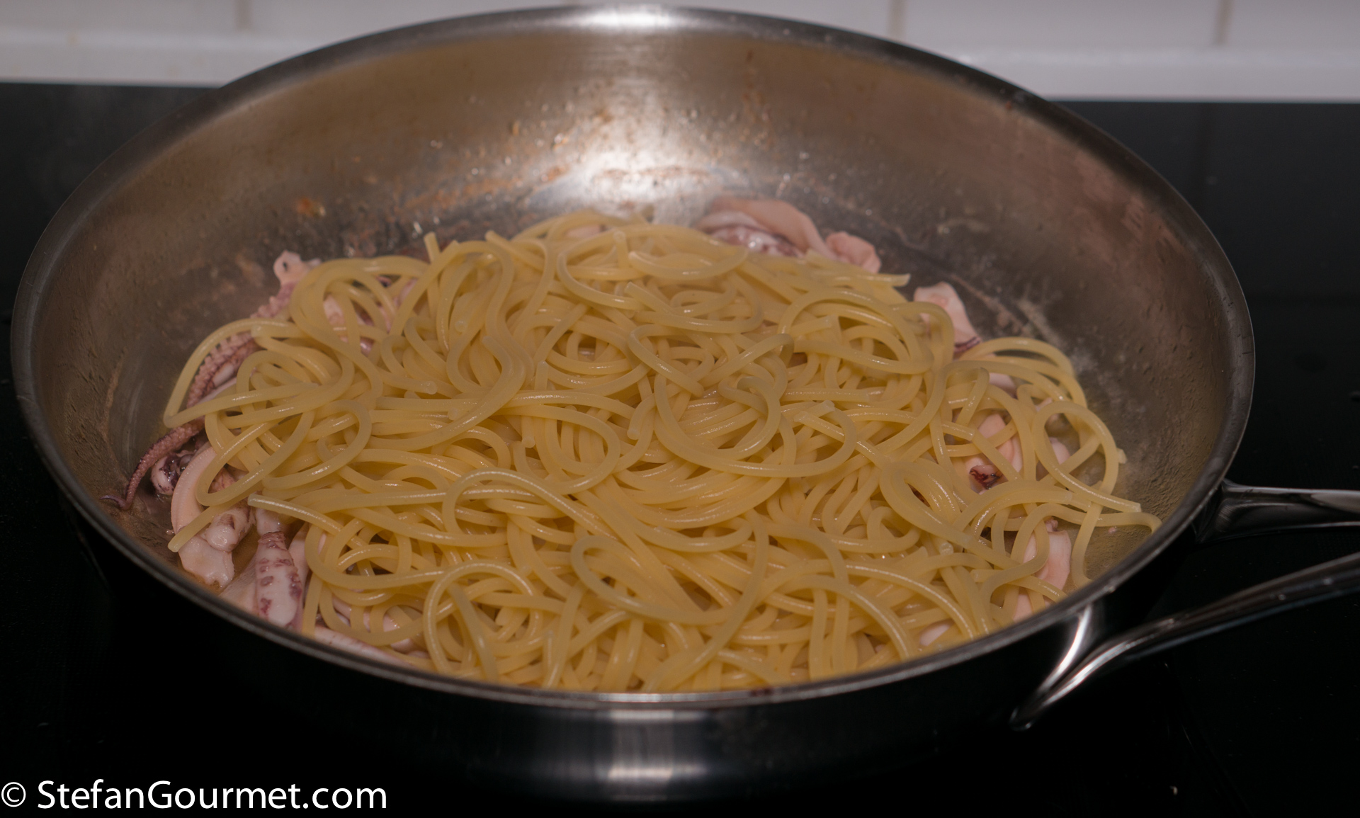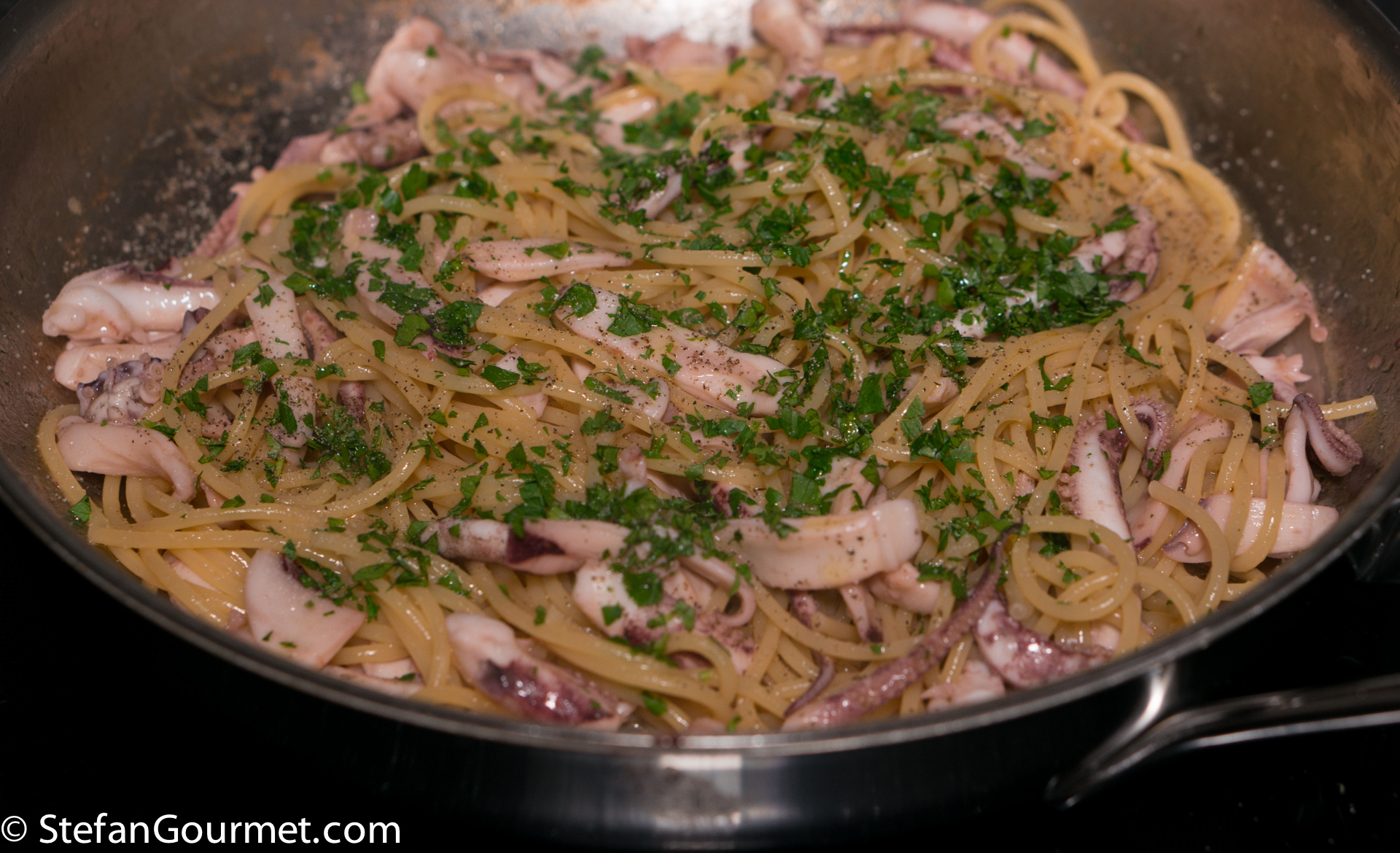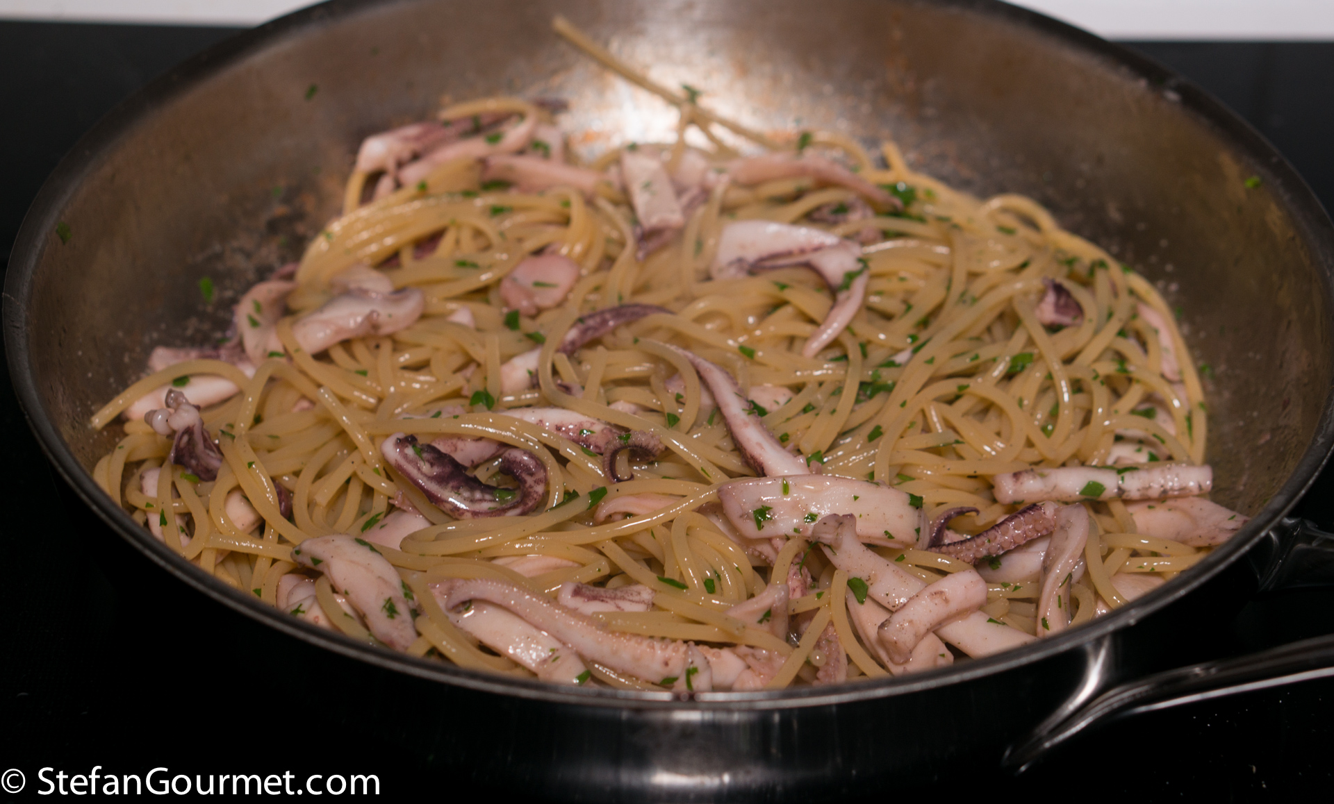 Squid can be cooked either briefly or low and slow. If cooked briefly it is tender but with a lot of bite to it, and when cooked low and slow it becomes very tender. I already have several recipes for squid cooked slowly in tomato sauce (like this one), but this time I wanted to keep it as simple and as quick as possible. The squid should be cooked very briefly, which means that you should actually wait until the spaghetti is almost ready before you start with the sauce. Otherwise you risk cooking the squid for too long, leading to rubbery squid.