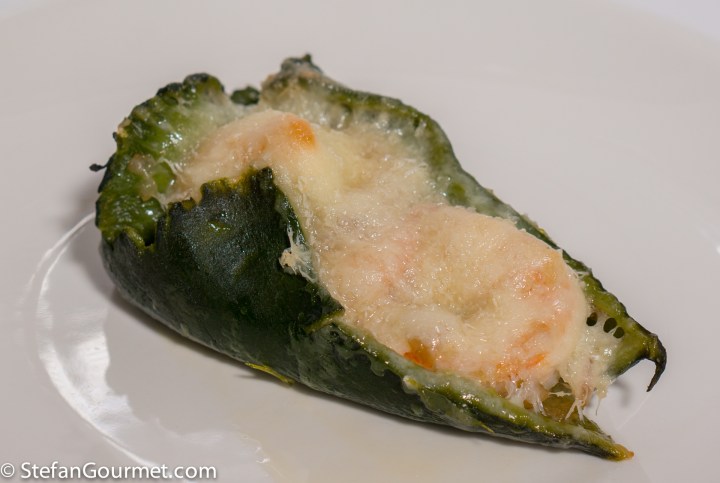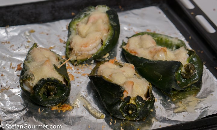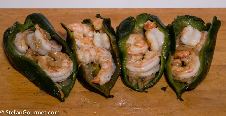 This recipe is quite simple with a limited number of ingredients, but very tasty. The combination of textures and flavors works really well: spicy pepper, earthy shrimp, sweet soft onions, and cheesy cheese. If Poblano peppers are not available or you don’t like the spiciness (they are not that spicy actually), you could substitute them with bell peppers of any color and it would also be great. The only real work is skinning and seeding the peppers.