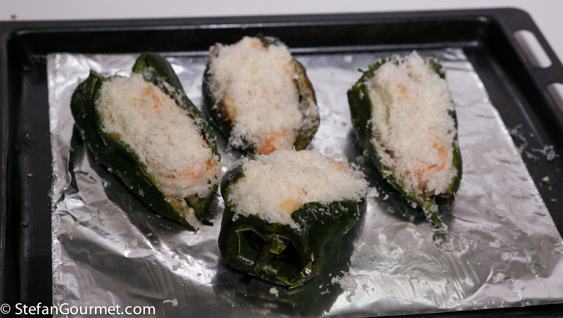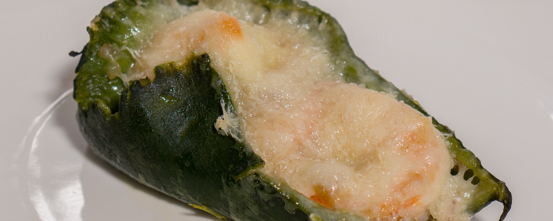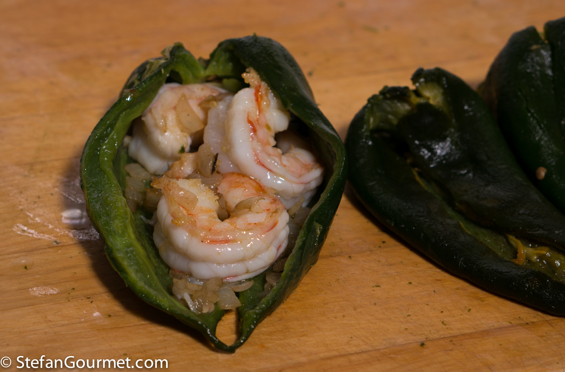 This recipe is quite simple with a limited number of ingredients, but very tasty. The combination of textures and flavors works really well: spicy pepper, earthy shrimp, sweet soft onions, and cheesy cheese. If Poblano peppers are not available or you don’t like the spiciness (they are not that spicy actually), you could substitute them with bell peppers of any color and it would also be great. The only real work is skinning and seeding the peppers.