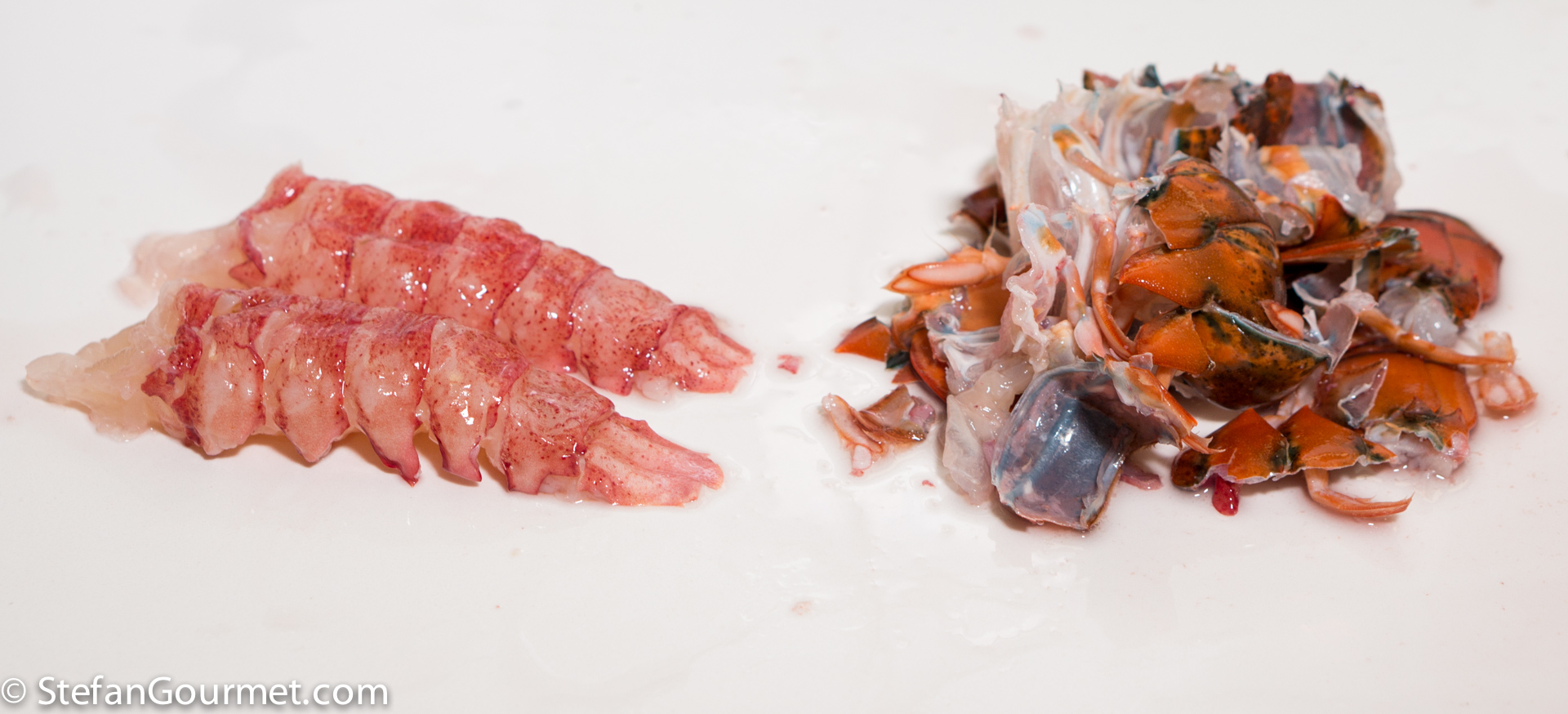 Get out all of the lobster meat. Keep the nice parts of the claws separate and combine the other meat (soft part of the claws, legs, and knuckles) in a bowl. Reserve the shells, but discard all the parts that will give a bitter flavor to the stock like the gills.