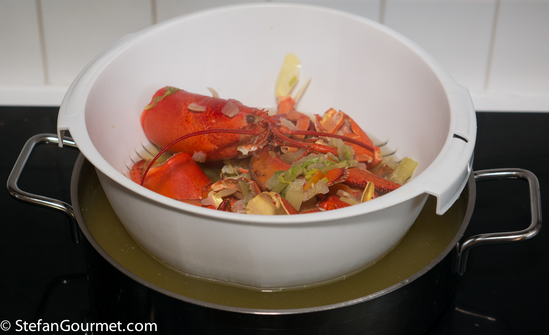 Add the lobster shells to the lobster cooking water together with chopped celery, onion, and carrot. Bring to a boil and allow to simmer for an hour.
