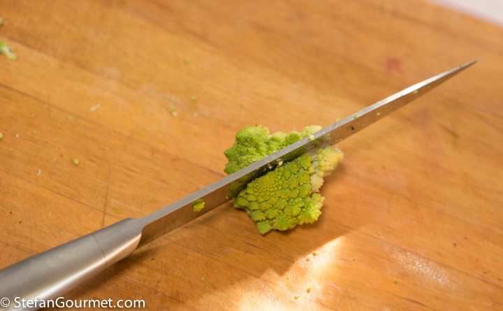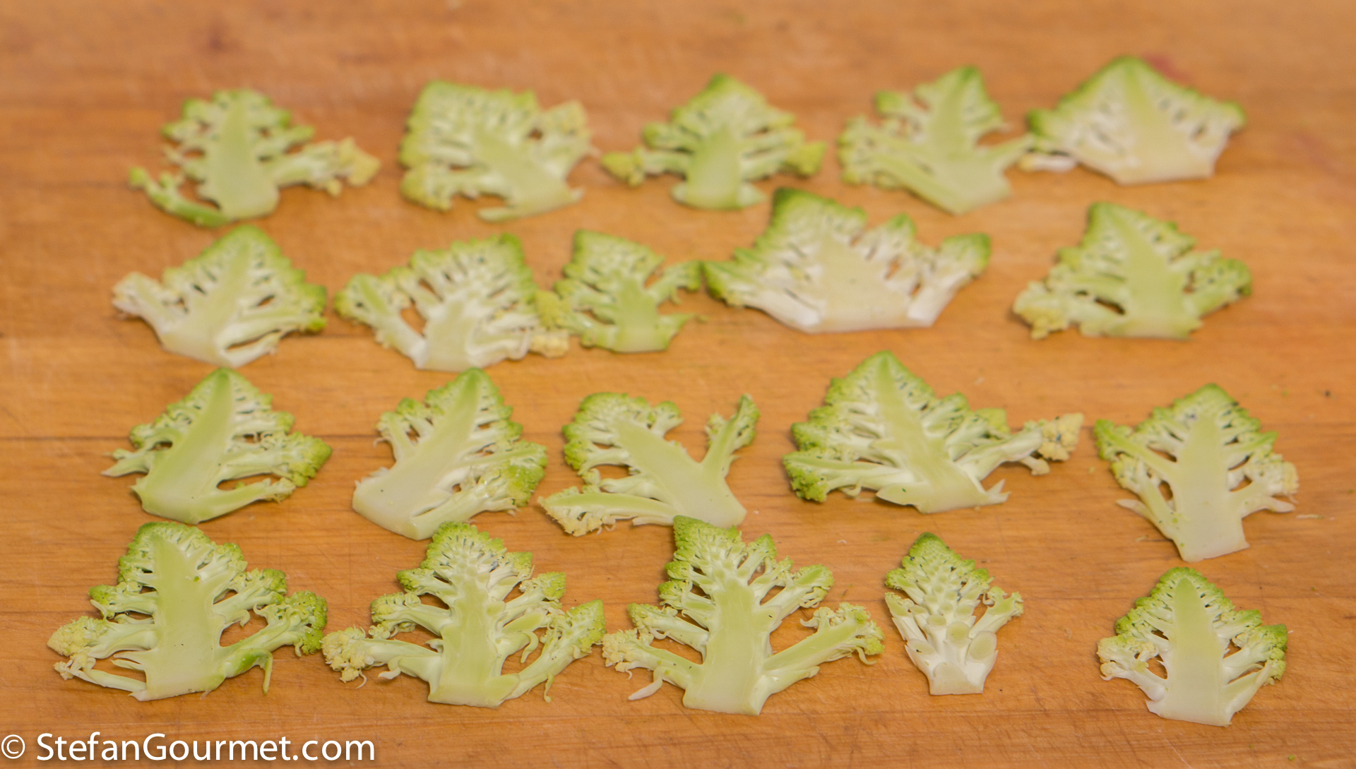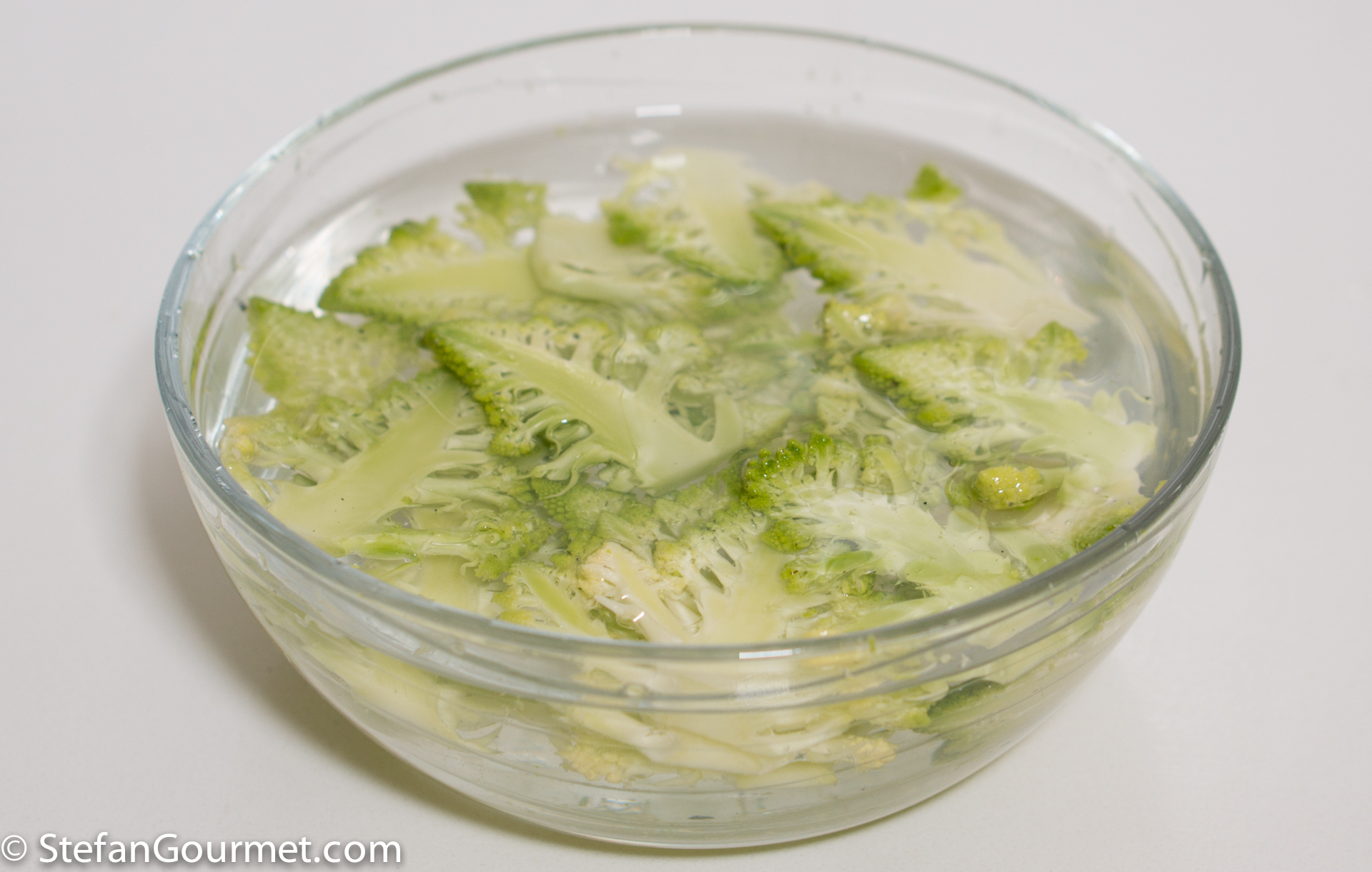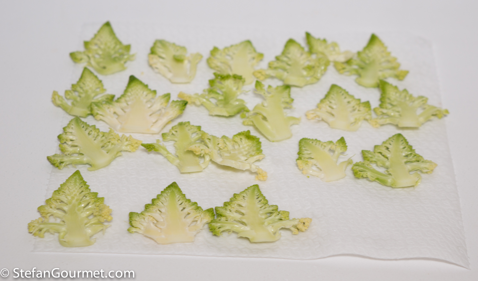 Reserve the romanesco slices in a bowl with cold water and refrigerate to keep them crunchy.