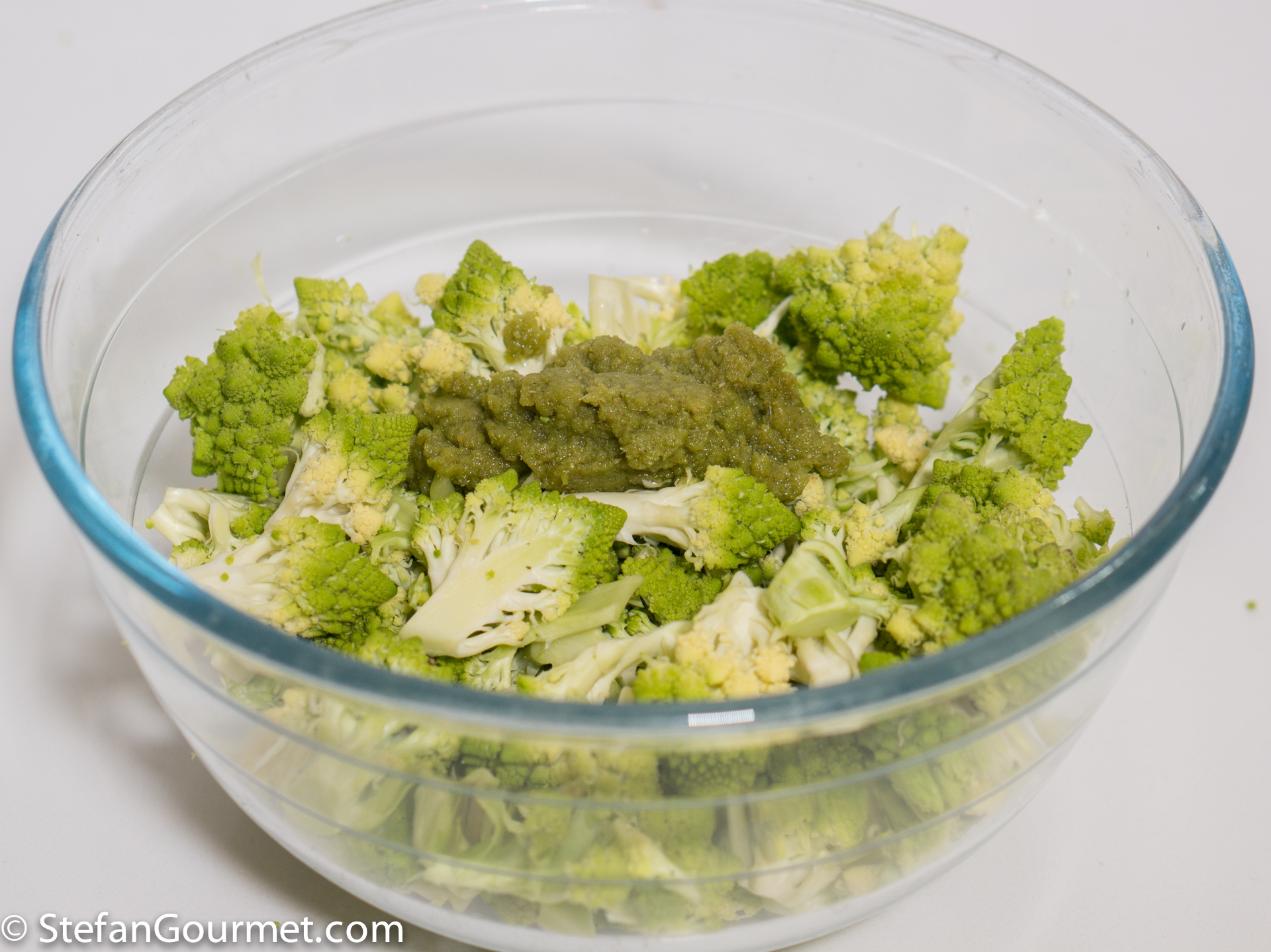 You will need about 300 grams (.66 lb) of romanesco. Use the florets only, not the trunk. Combine it with the curry paste in a bowl and mix.
