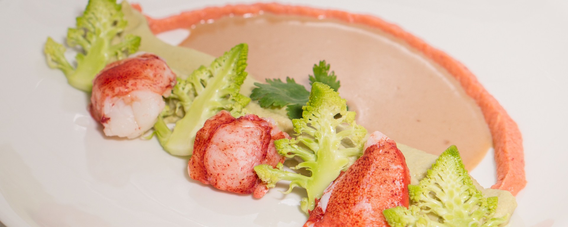 Reheat the morsels of lobster meat sous-vide at 54C/129F for 10-15 minutes. You could also reheat or keep warm the lobster and romanesco mousse by putting the piping bags in the sous-vide.