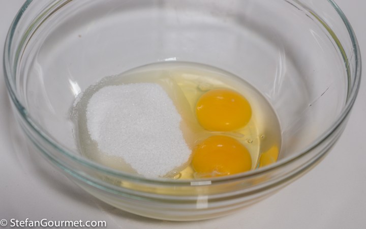 Combine 100 grams sugar with 2 eggs in a large bowl.