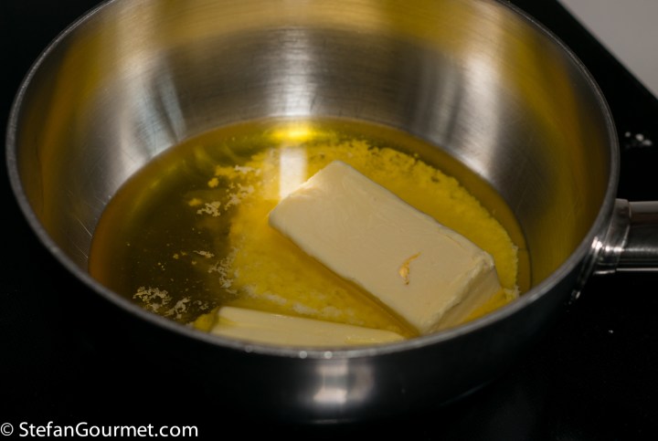 Melt 125 grams butter over low heat and allow to cool somewhat.