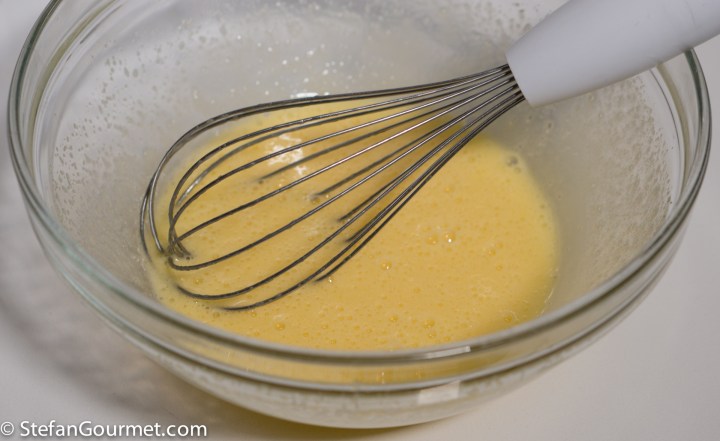 Add the melted butter (making sure that the butter has cooled off to 50C/120F or less to prevent prematurely cooking the eggs), and stir to incorporate.