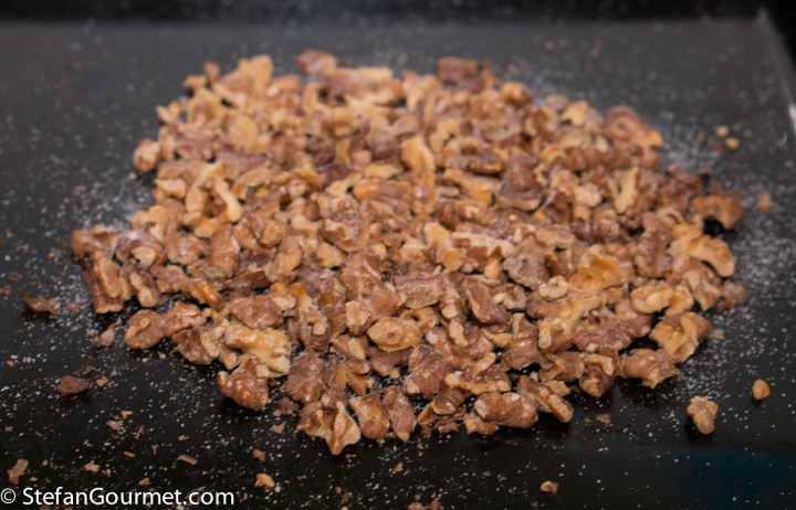 Toast 100 grams of walnuts in the oven for 10 minutes at 170C/340F. (Do not toast the walnuts to be used for garnish.)