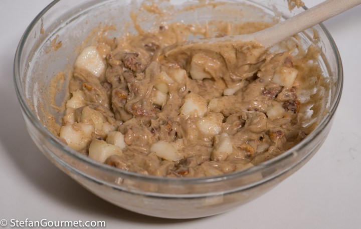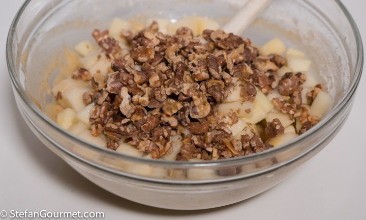 Peel, core and dice 2 of the pears. Add the diced pears and crumbled walnuts to the batter.