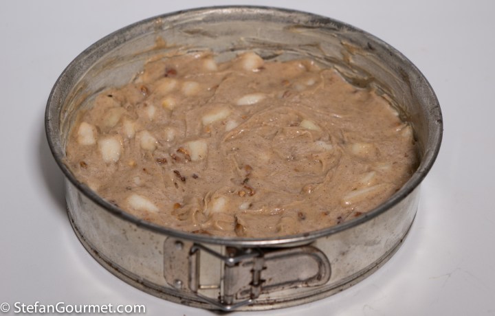Because of the pears this cake is nice and moist inside. As always when using nuts, their flavor is brought out by toasting them before use.