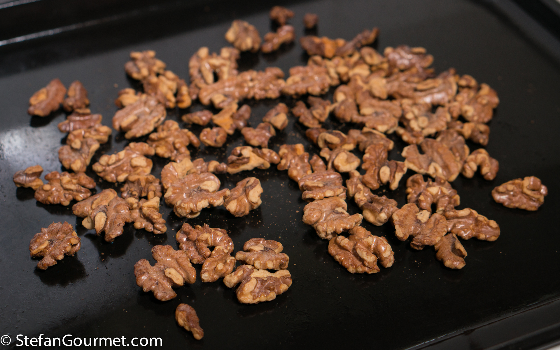Toast 100 grams of walnuts in the oven for 10 minutes at 170C/340F. (Do not toast the walnuts to be used for garnish.)