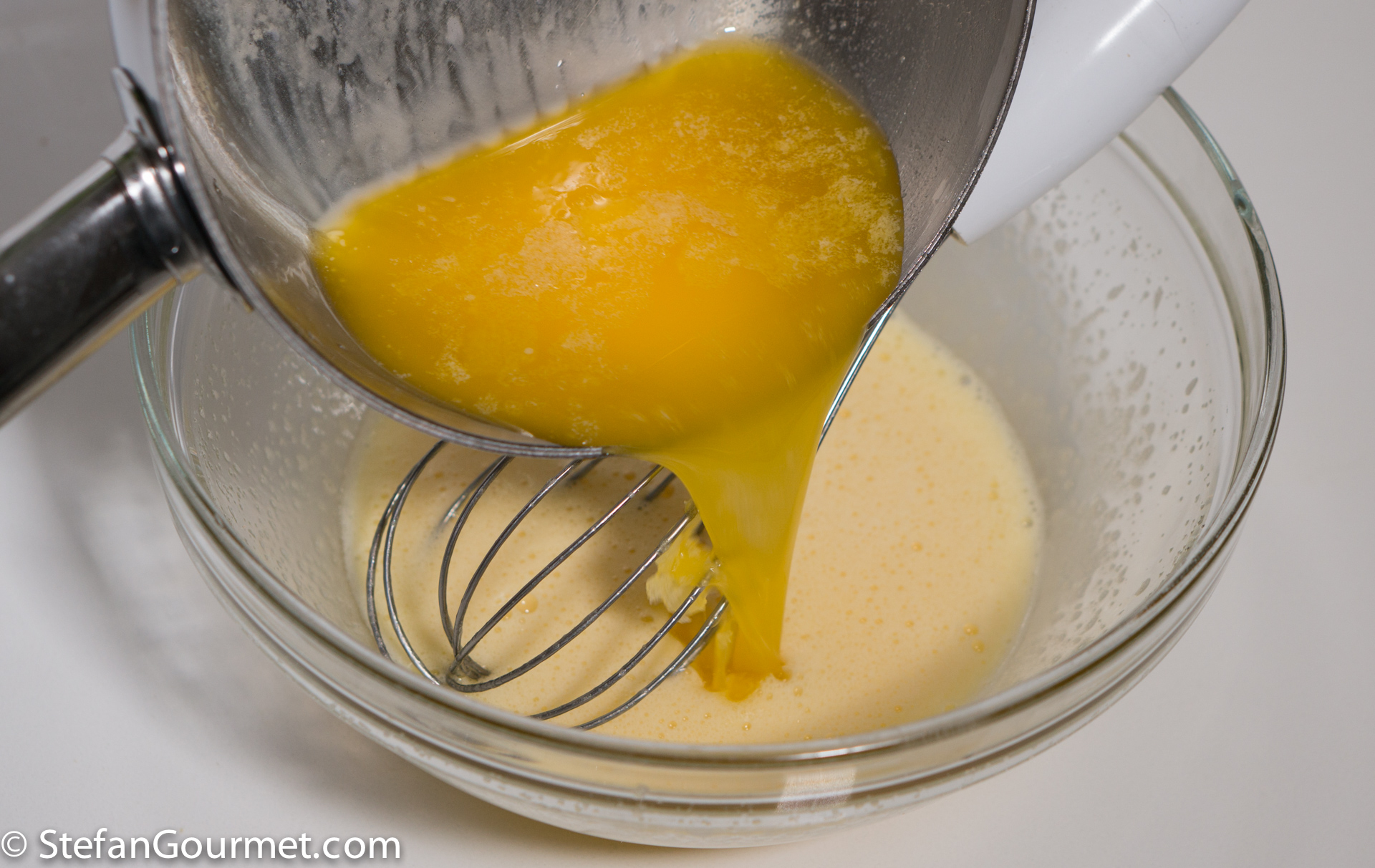 Add the melted butter (making sure that the butter has cooled off to 50C/120F or less to prevent prematurely cooking the eggs), and stir to incorporate.