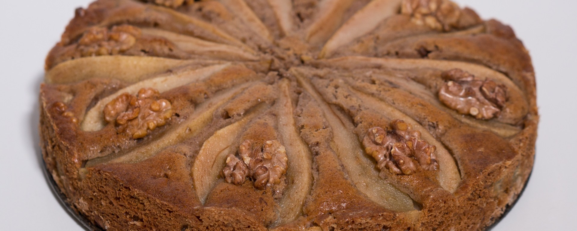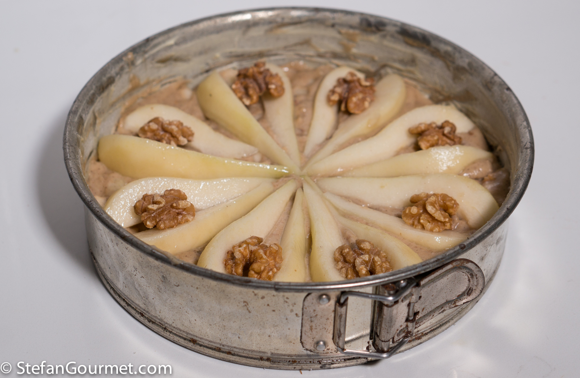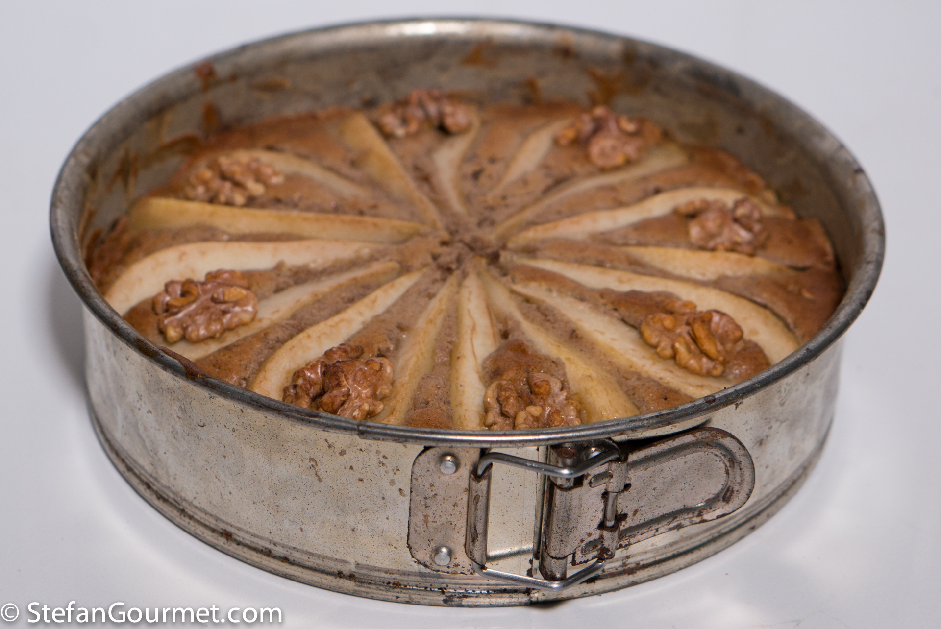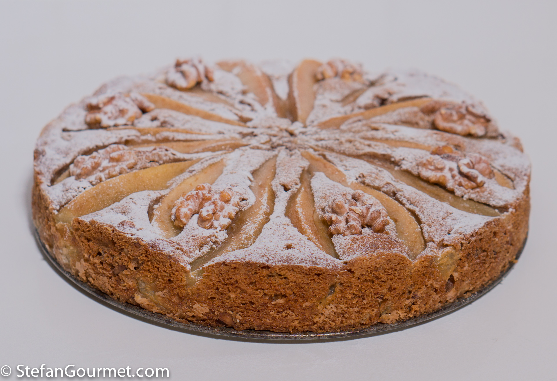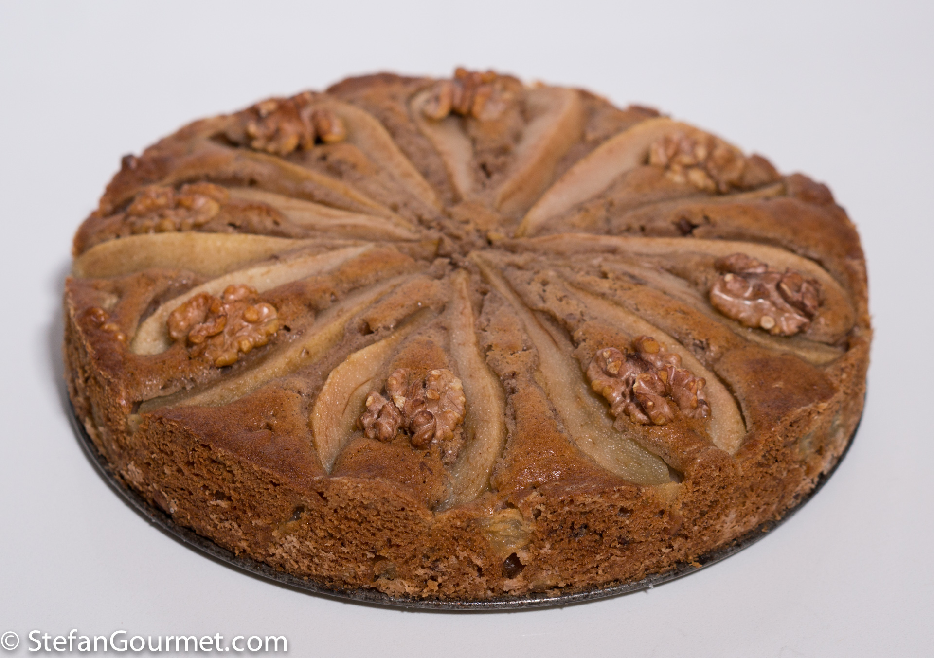Because of the pears this cake is nice and moist inside. As always when using nuts, their flavor is brought out by toasting them before use.