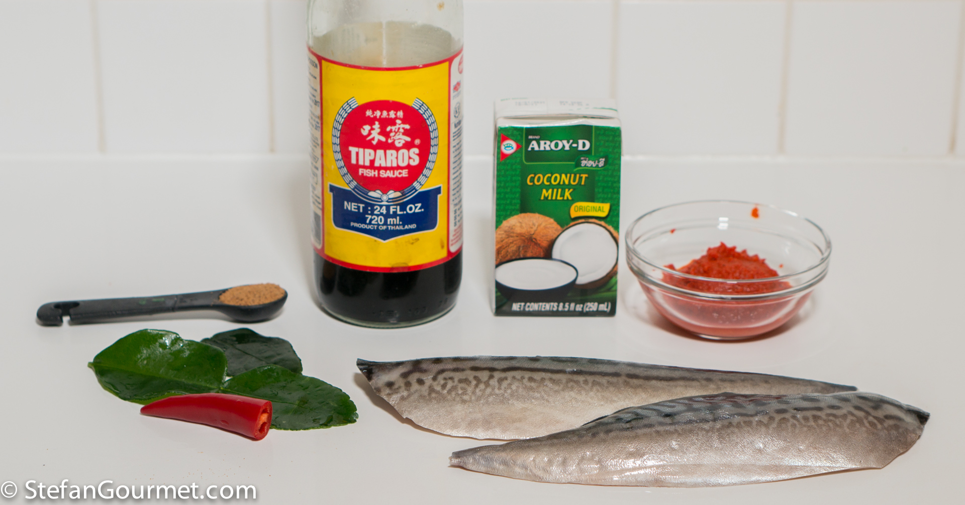 My friend Melvin is great with Asian food. The other day he prepared this mackerel in Thai red curry sauce for us, and it was so good that I wanted to make it myself as soon as possible. Melvin got to know this dish in Thailand, and got the recipe from Hot Thai Kitchen. He improved the technique for cooking the mackerel however: rather than pan frying both sides, just pan fry the skin until crispy and then finish cooking the flesh side in the residual heat of the sauce. That way, the mackerel stays more moist. In Thailand this dish is called Choo Chee and it can be prepared with any kind of seafood. I’d say however that mackerel is a very good choice as the flavor of the mackerel can stand up to the curry sauce. The dish benefits from homemade Thai red curry paste, but you could also use store-bought curry paste.