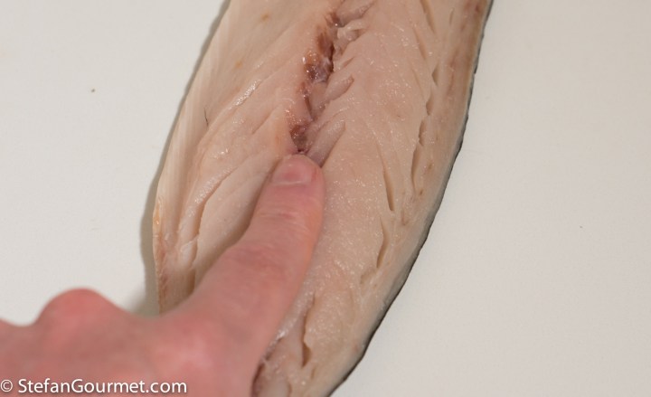 Remove the bones from the mackerel using tweezers.