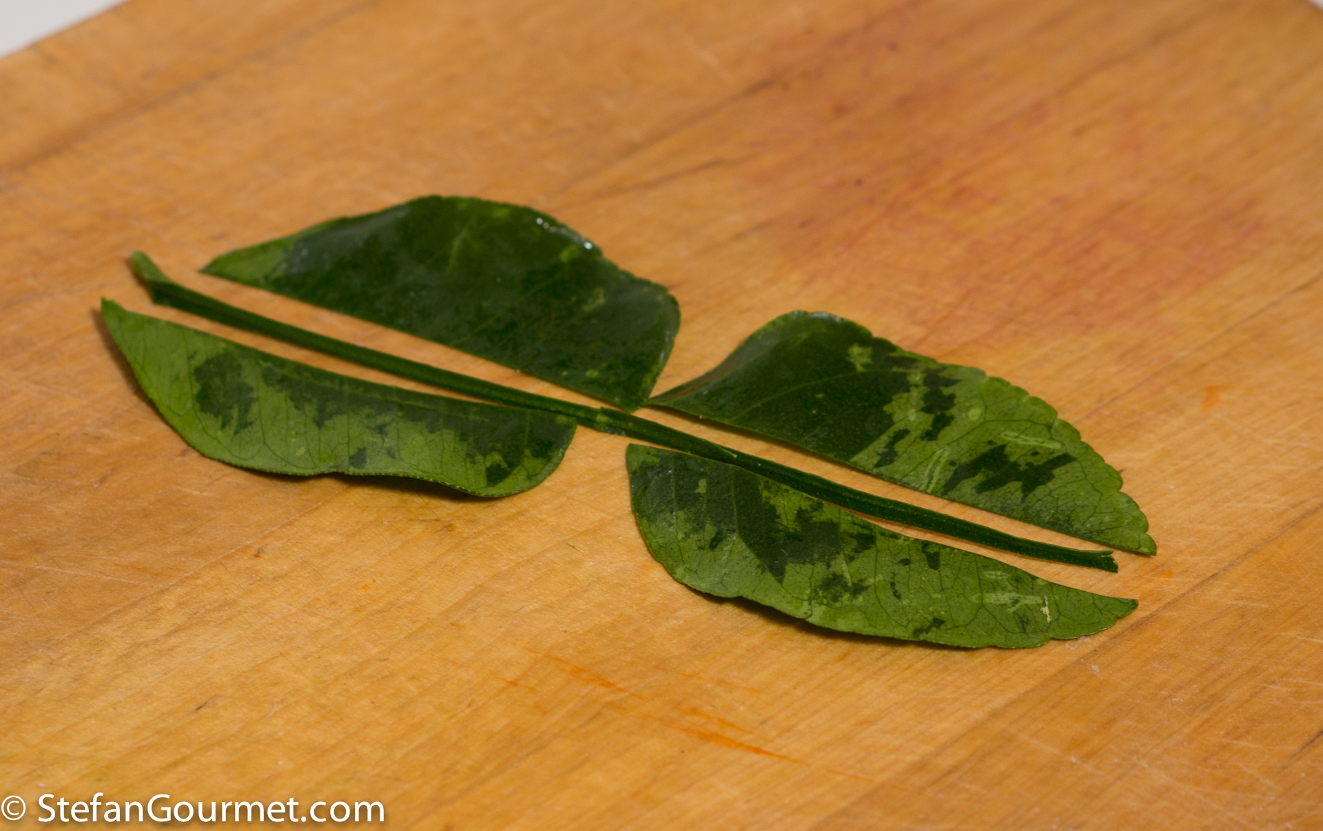 Slice the lime leaves into thin julienne, the thinner the better.