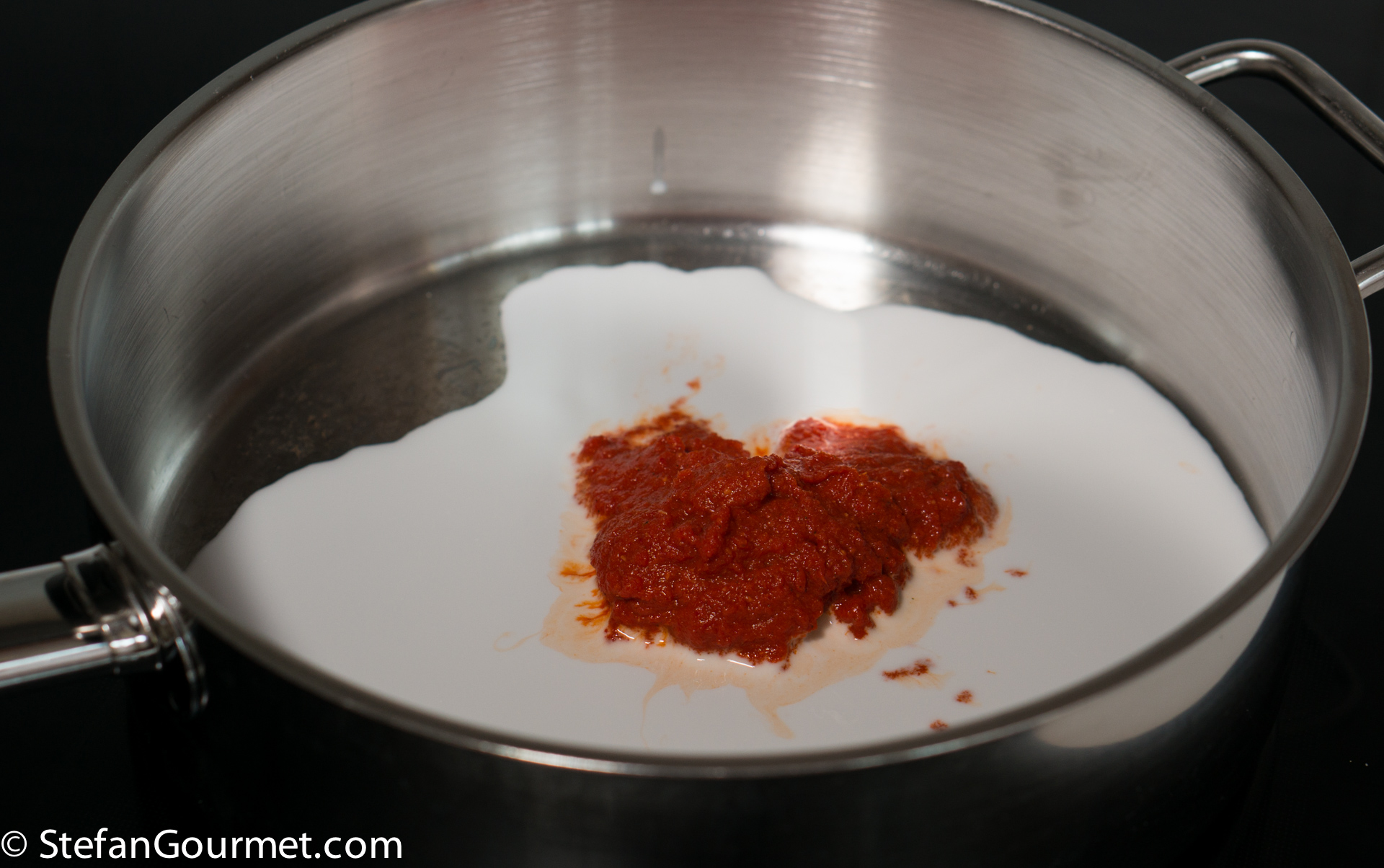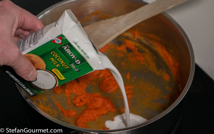 Now add 160 ml (2/3 cup) coconut milk, so you will have 2 tablespoons left for garnish.