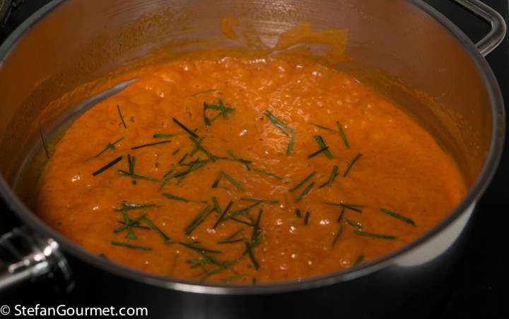 Simmer the sauce until it is almost as thick as you like it, then add half of the kaffir lime leaf julienne.