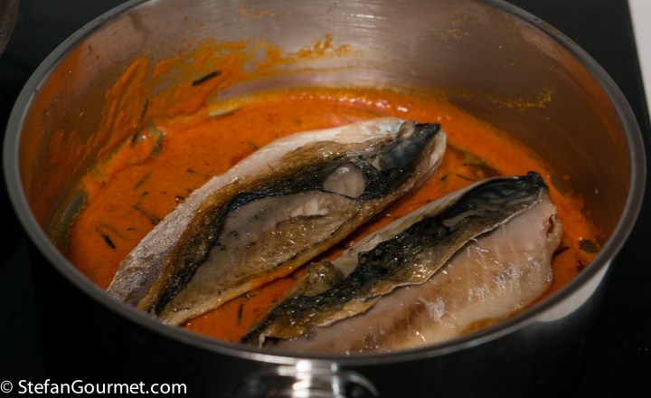 Put the mackerel with the skin up in the sauce. The residual heat will cook the mackerel in about 5 minutes.