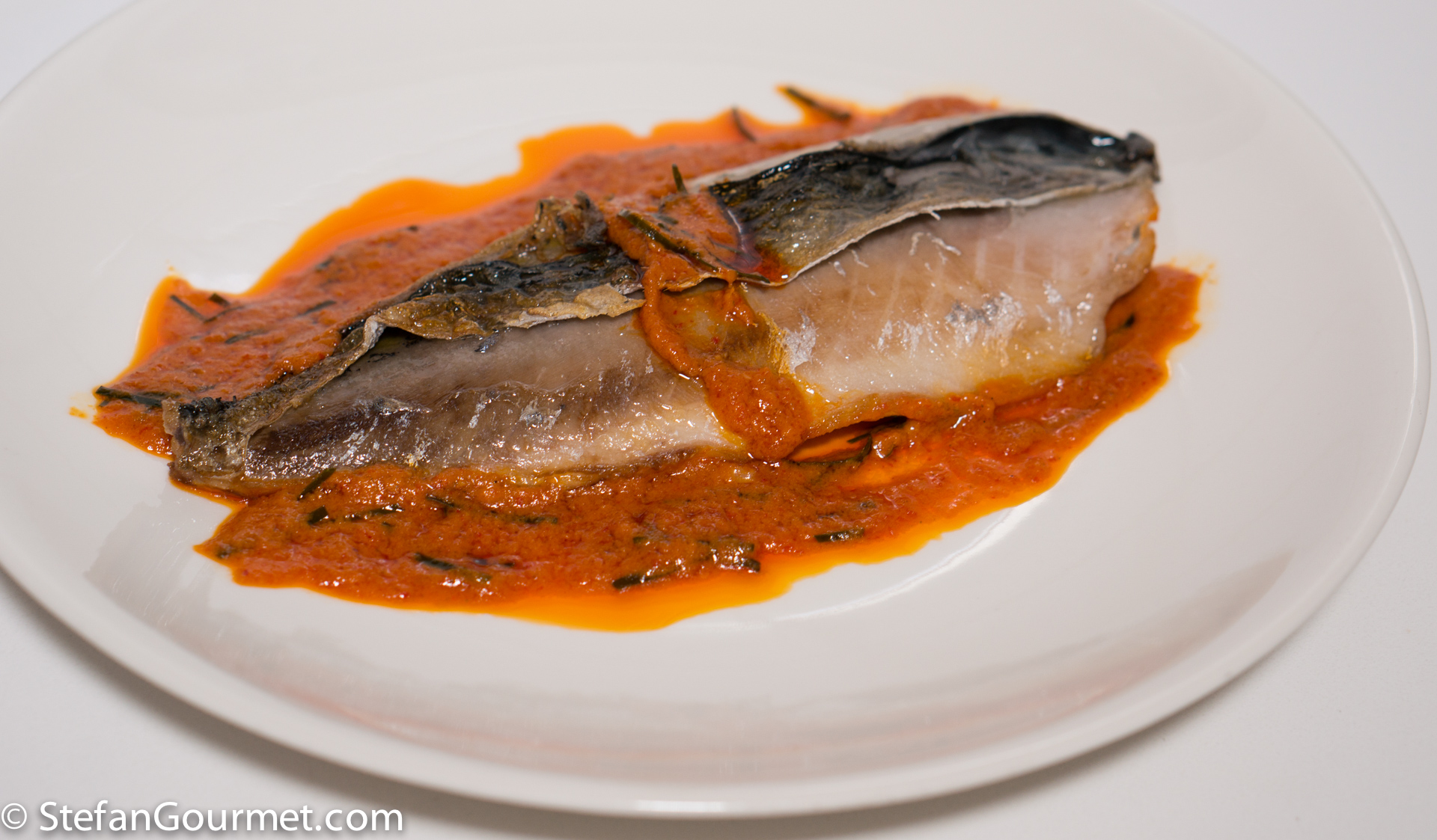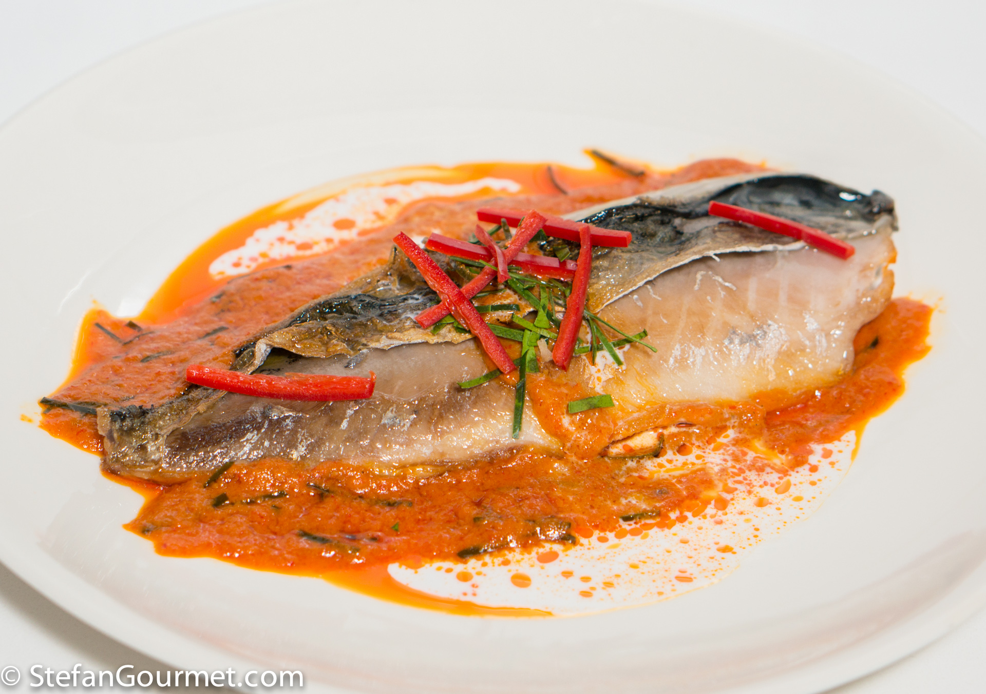 To serve, put the mackerel on preheated plates and spoon the sauce around it to keep the skin crispy. Place only a bit of sauce on top for garnish.