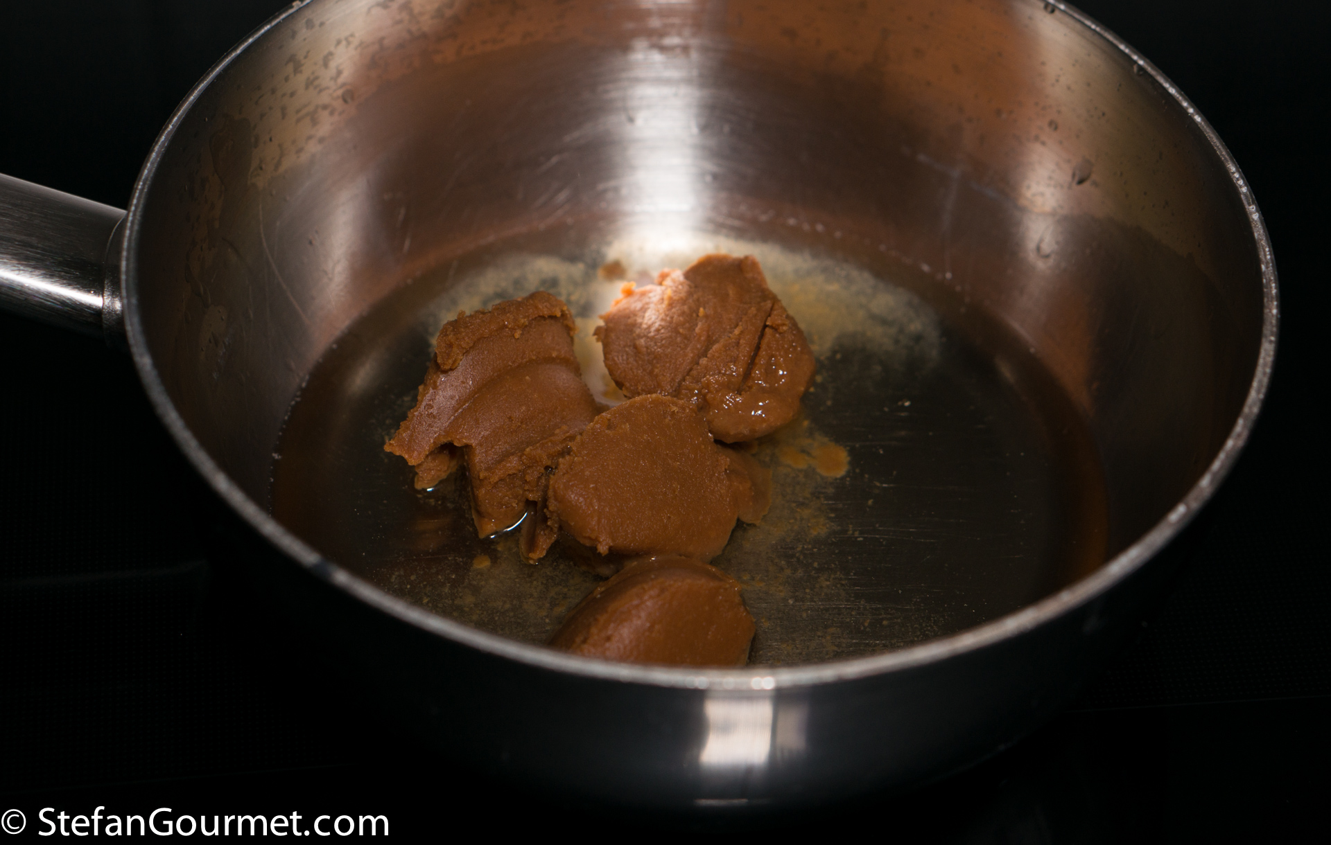 Curing fish improves its texture for cooking sous-vide, and this miso cure also adds flavor. This recipe is often prepared with black cod, a type of fish that is not available here. I prepared it with salmon instead, and it turned out great. An advantage of the technique I used here is that you can use the same bag for marinating as well as cooking the fish. Allow enough time for the cure to penetrate all the way into the salmon, 2 to 3 days.