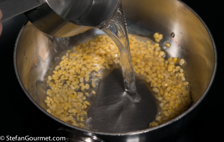 For the toasted mung beans, rinse 2 tablespoons of shelled split mung beans twice in cold water. Then put them in a saucepan and cover with half a litre (2 cups) of cold water.