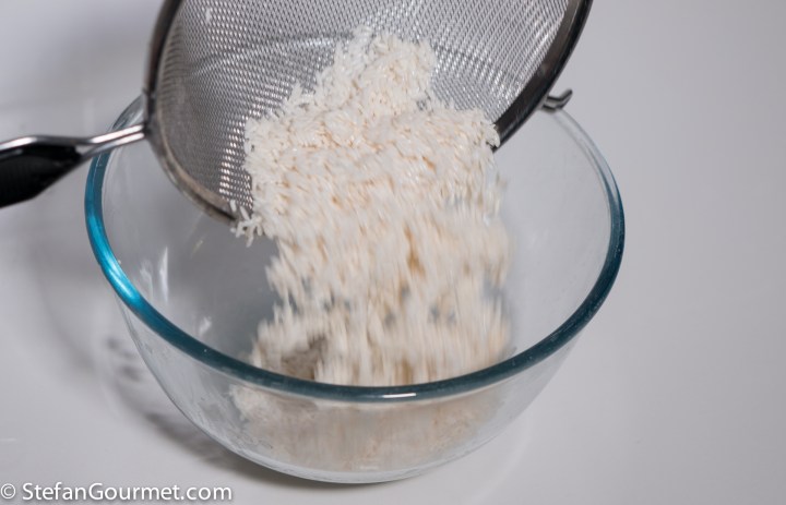 Drain the rice and return it to the bowl to was it again. Repeat this until the water remains almost clear, about 5 times in total.