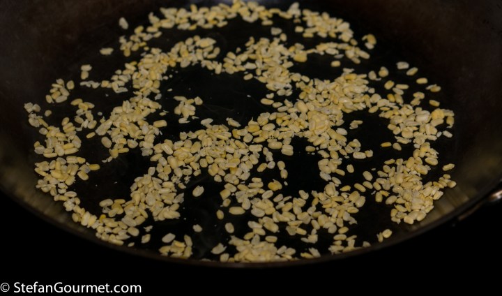 Toast the mung beans in a frying pan over medium heat until crispy and slightly golden.
