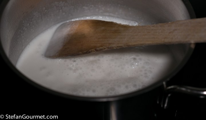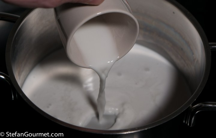 For the salted coconut sauce, put 120 ml coconut milk in a saucepan. Mix 1 teaspoon of rice flour with 1 tablespoon of cold water and mix well until there are no lumps. Add this slurry to the coconut milk.