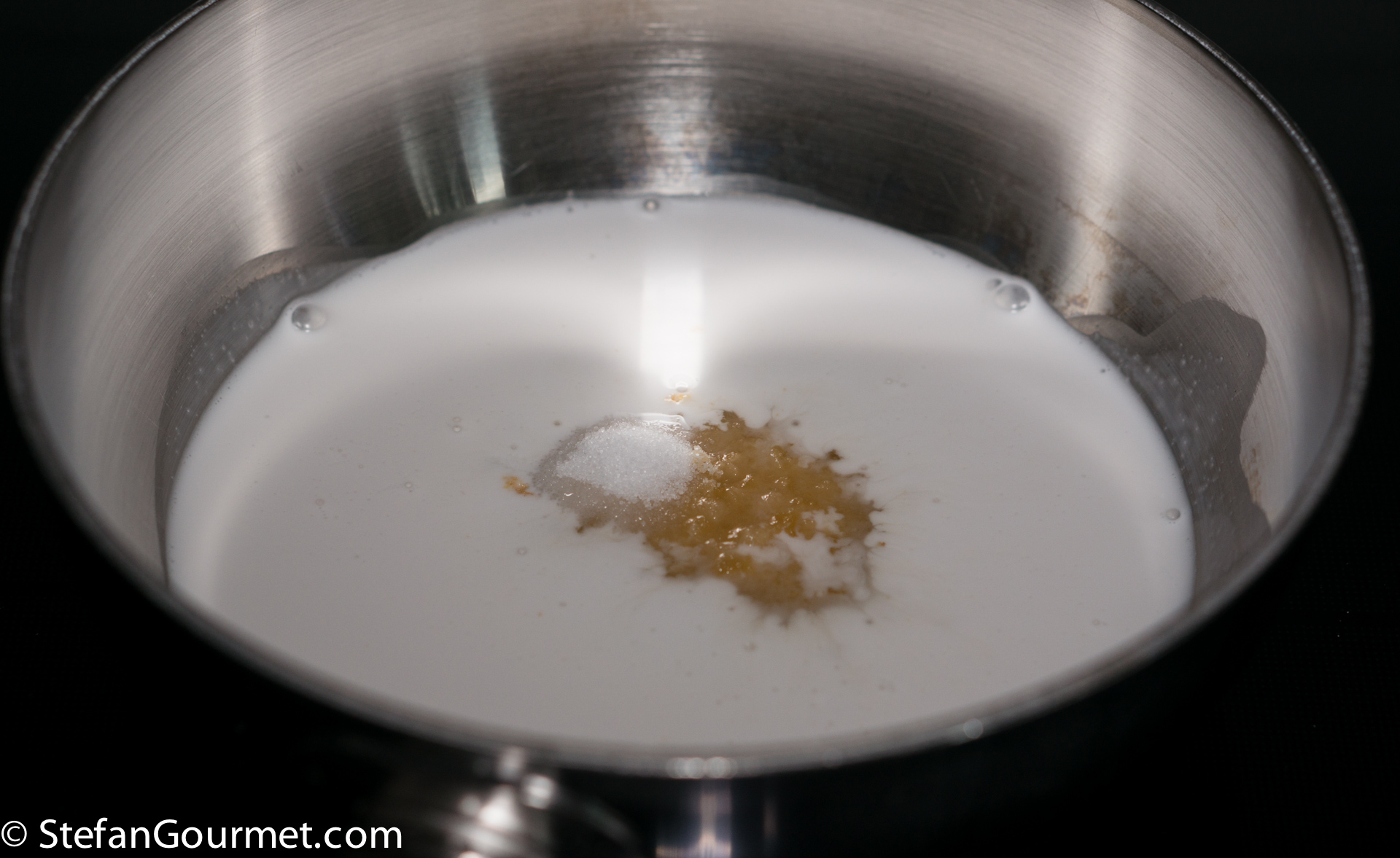 Combine 160 ml (2/3 cup) coconut milk with 100 grams palm sugar and 1/2 teaspoon of salt in a saucepan.