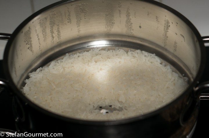 Put some water in the steamer, cover the rice, bring the water to a boil, and steam the rice for 30 minutes.