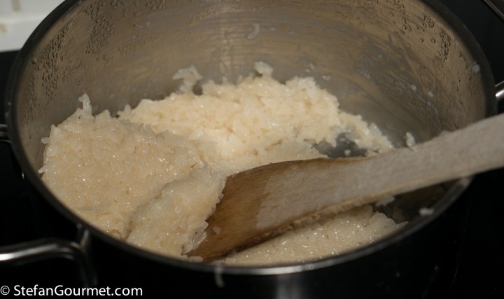 Once the rice has been steamed, mix it with the coconut syrup. It doesn’t matter if you add the rice to the syrup or the syrup to the rice, whichever is most convenient.
