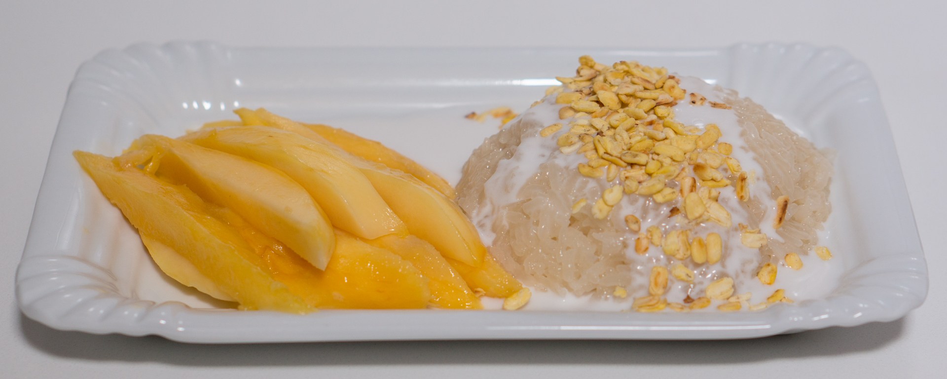 Peel and slice the mangos. Serve them with the sticky coconut rice, garnished with the salted coconut sauce and the crispy mung beans.