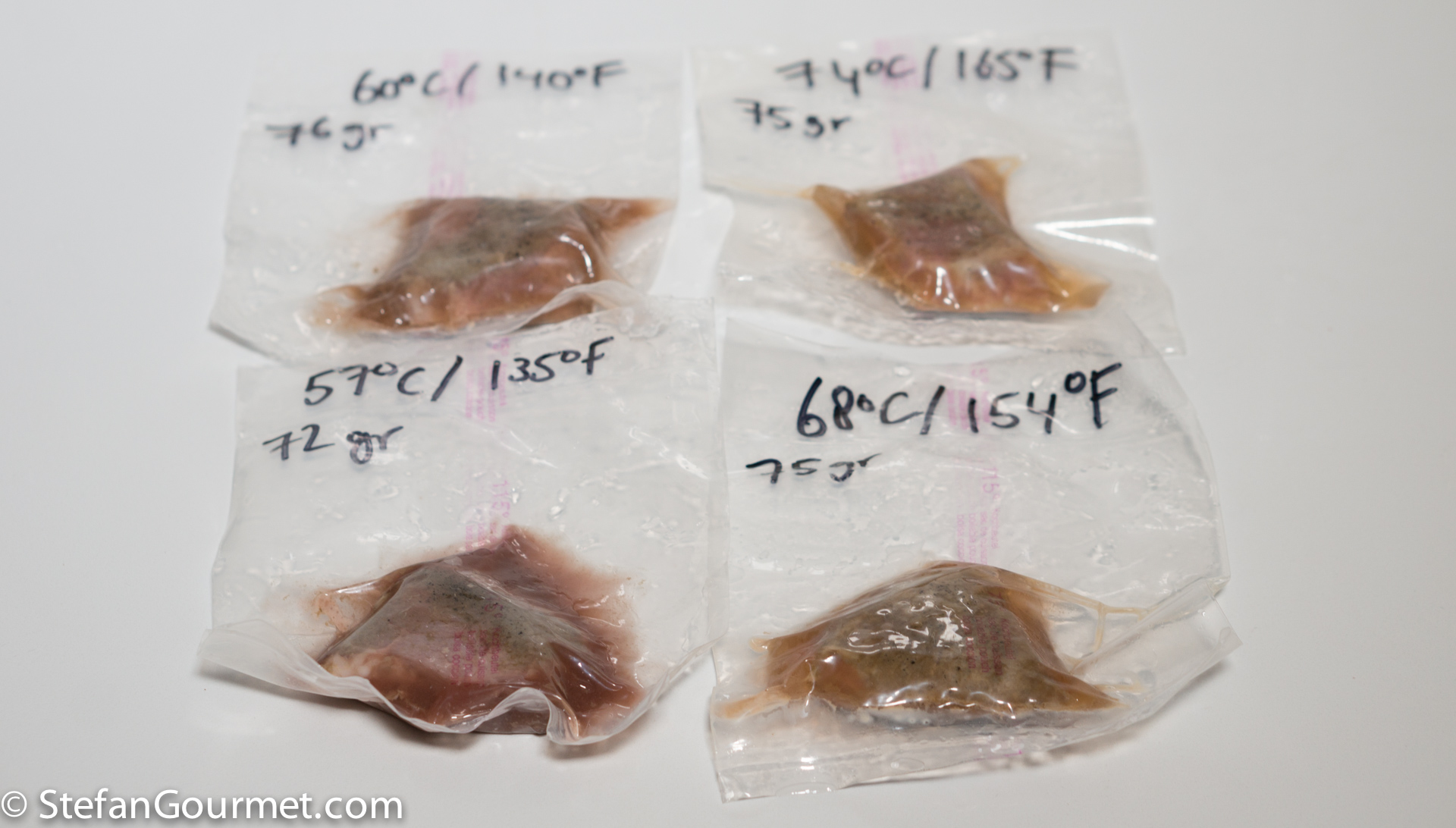 I salted and vacuum sealed them, and decided to try the following temperatures, all for 24 hours: 57C/135F, 60C/140F, 68C/154F, and 74C/165F.