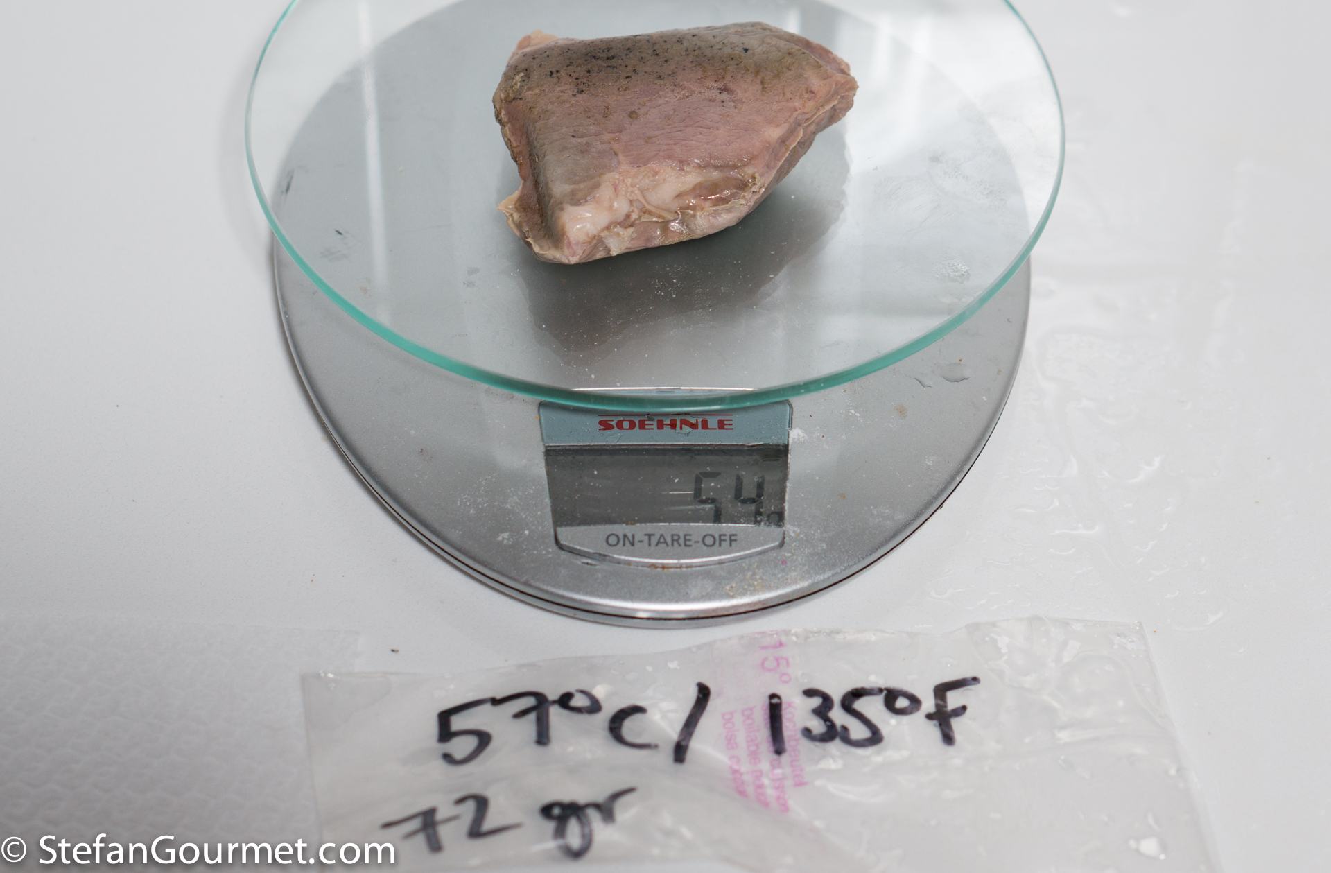 For cooking at 57C/135F it is important to scald the meat in very hot or boiling water (at least 77C/170F), after vacuum sealing but before sous vide cooking, to avoid a bad smell. To make the comparison as honest as possible, I gave all four pieces that treatment.