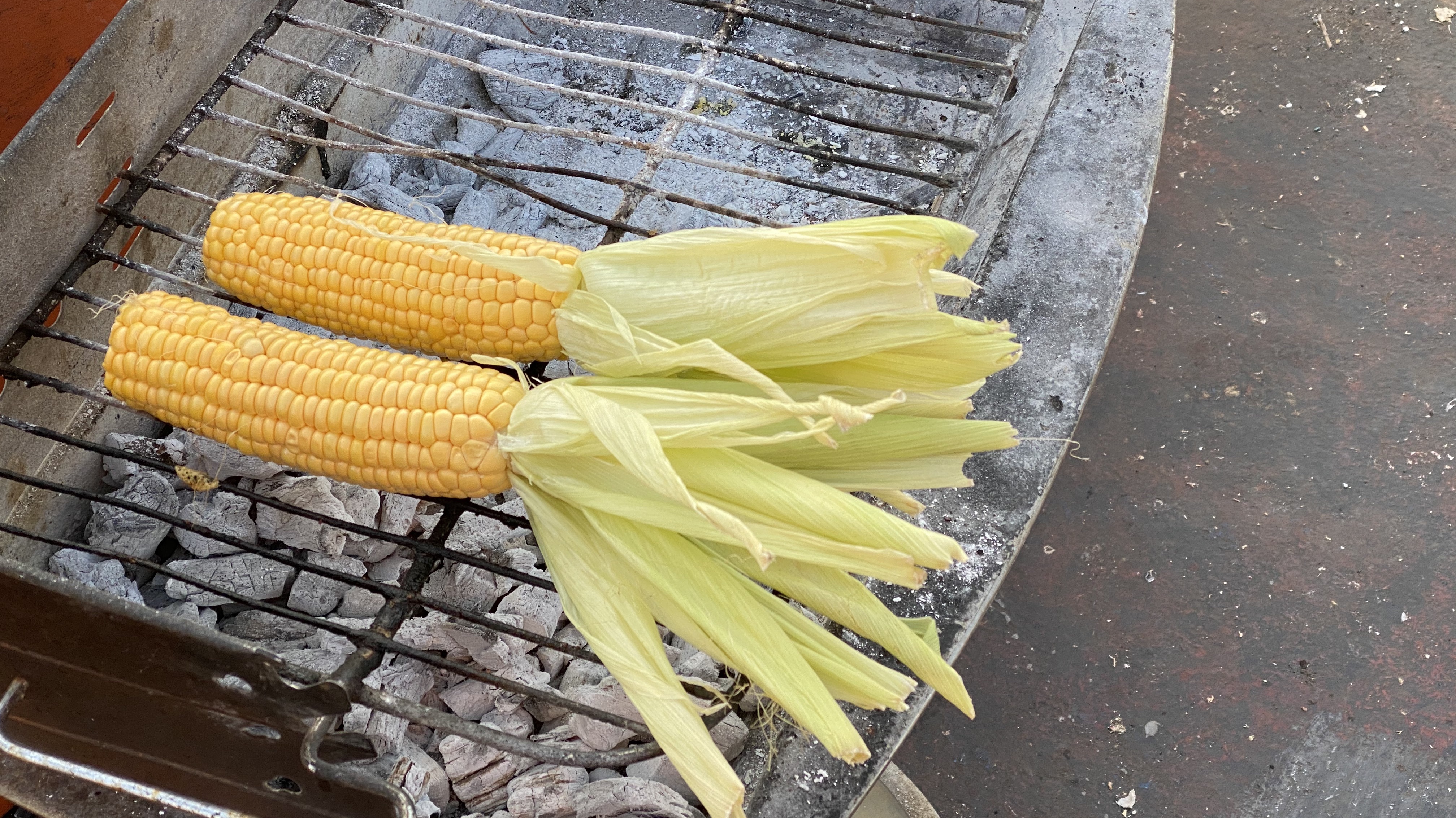 Fold the husk over to serve as a handle. Grill the corn on a charcoal fire, turning it regularly so it will be cooked evenly.