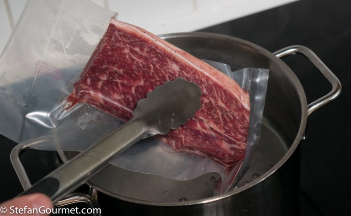 I tried to google it to find out what it was, but found contradicting information. According to some source it is cross-cut strip steak, according to others cross-cut boneless short ribs. Because of the high amount of marbling I decided to cook the beef sous-vide at a temperature of 57C/135F.