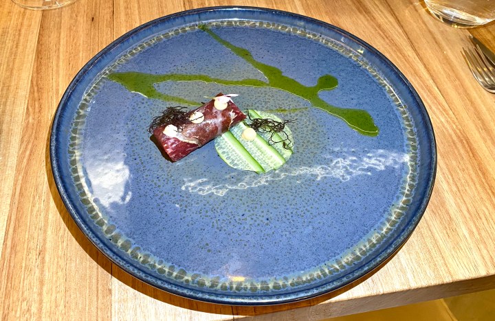 The rosé was a good pairing for a ‘canneloni’ of cecina, stuffed with beef and scampi tartar, and served with cucumber carpaccio. Cecina is dried beef, in this case similar to Bresaola. Very nice indeed. 8/10